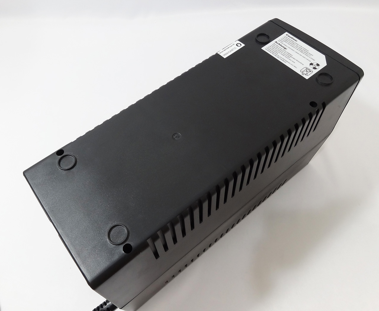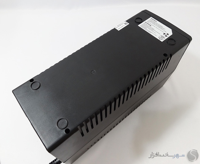 در تصویر بالا نیز نمای زیرین این دستگاه را مشاهده میکنید. کاملاً مشخص است که هر دو بخش بدنه پلاستیکی این یو پی اس تنها توسط 4 عدد پیچ به یکدیگر متصل شدهاند. بر چسبهای مربوط به باطل شدن گارانتی و اخطار مربوط به خطرناک بودن دسترسی افراد غیرمتخصص به داخل دستگاه نیز در این بخش به چشم میخورد.
