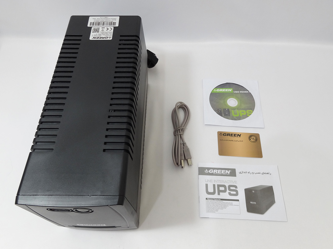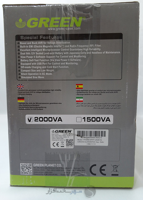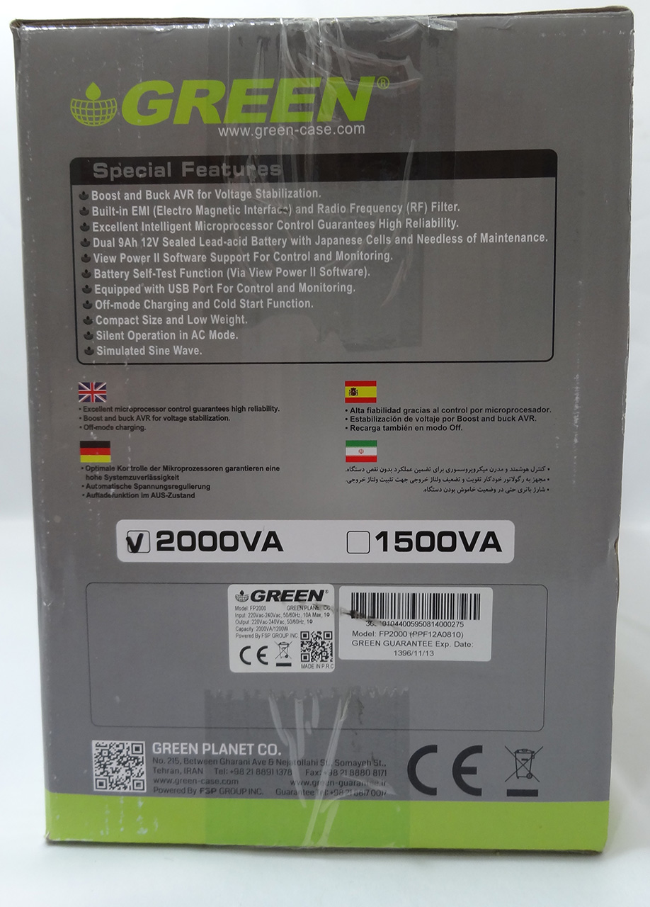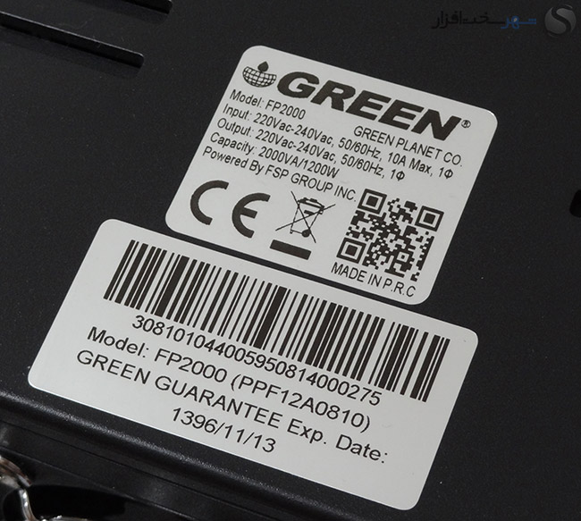 در بخش بالایی بدنه دستگاه نیز برچسب مربوط به گارانتی و مشخصات فنی دستگاه درج شده است. نکته جالب توجه در این بخش اشاره کمپانی گرین به سازنده اصلی این یو پی اس یعنی کمپانی بزرگ FSP GROUP INC است. FSP در حال حاضر بزرگترین کمپانی تولیدکننده منابع تغذیه الکترونیکی در دنیا محسوب میشود. در واقع این UPS به سفارش کمپانی سیاره سبز و پس از اعمال تغییرات مورد نظر واحد فنی این شرکت توسط کمپانی FSP تولید میشود.