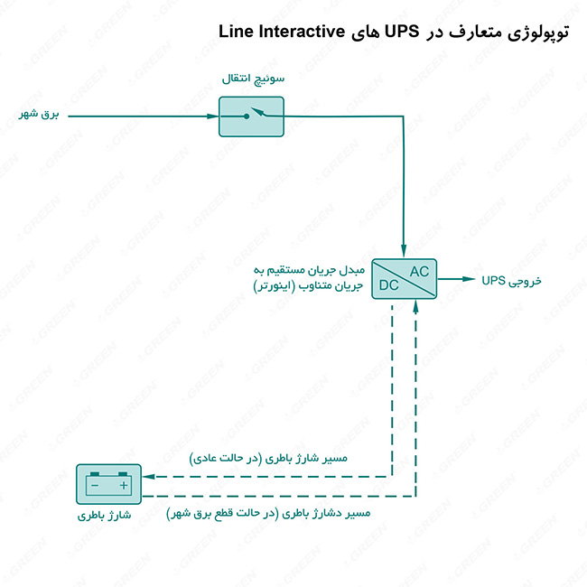 منظور از یو پی اس Line-Interactive، نوعی از UPS است که با مجهز بودن به تثبیتکننده ولتاژ (استابلایزر) در مسیر Bypass (خط کنارگذری که هنگام نرمال بودن شرایط، برق شهری را به خروجی متصل میکند) ولتاژ تنظیمشدهای را به بار میرساند. این نکته در واقع مزیت UPS لایناینتراکتیو نسبت به مدلهای آفلاین است.