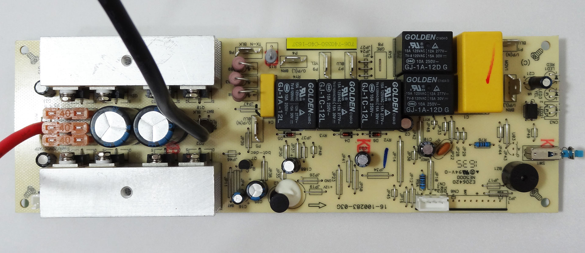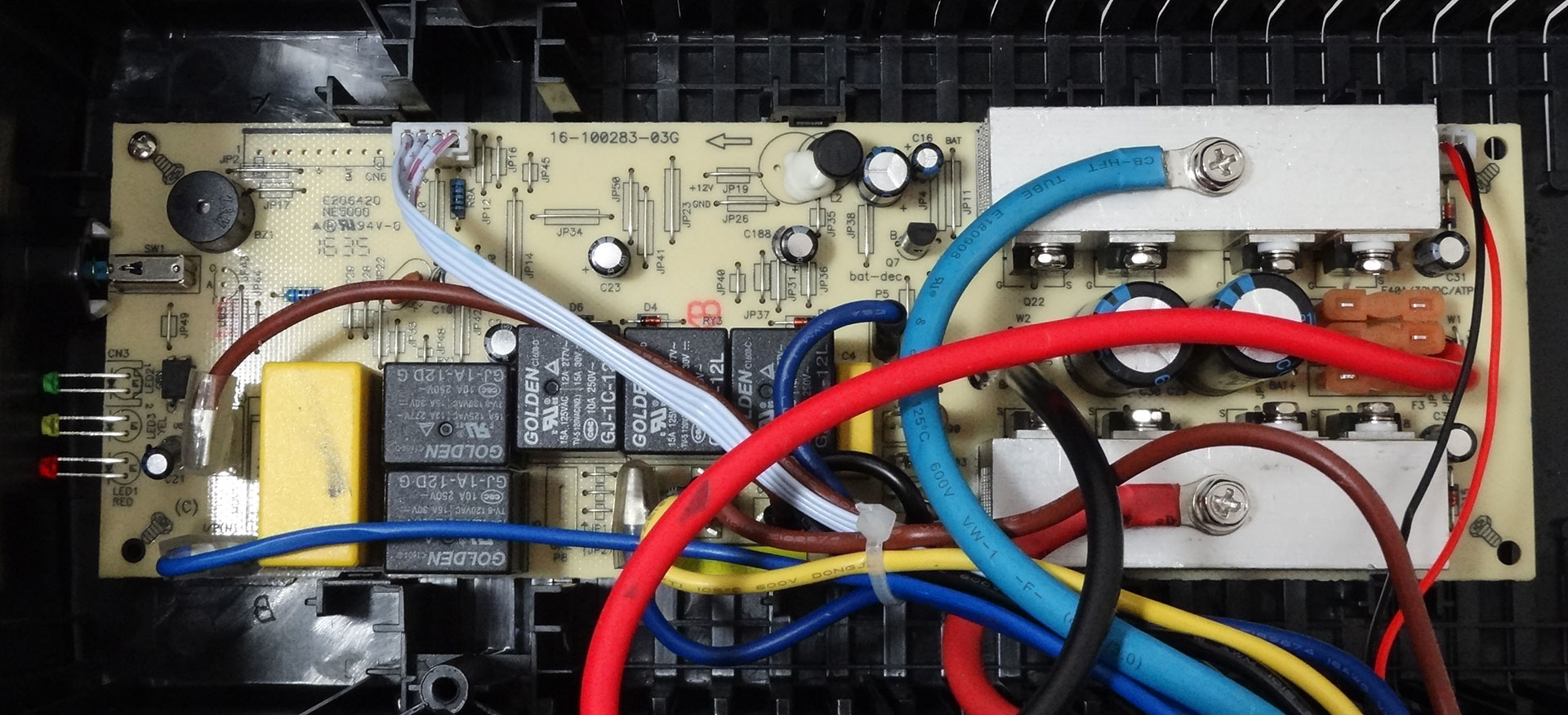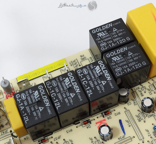 همانطور که اشاره شد فرآیند کنترل و مدیریت مسیردهی برق شهر در حالتهای شارژ باتری، مبدل جریان مستقیم به متناوب (اینورتر)، حالت Buck و Boost استابلایزر و انتقال بدون دخل و تصرف برق شهر به ترمینالهای خروجی توسط میکروپروسسور هوشمند این دستگاه صورت میگیرد؛ اما در بخش قدرت این مسیردهی در عمل توسط 5 عدد رله بسیار قدرتمند 2500VA ساخت کمپانی چینی Shenzhen golden electrical appliances صورت میگیرد. در واقع کمپانی سازنده در این بخش از رلههایی با قدرت سوئیچ 500VA بیش از توان نامی UPS استفاده کرده است. عاملی که نقش تعیین کنندهای در افزایش عمر و دوام این دستگاه خواهد داشت.