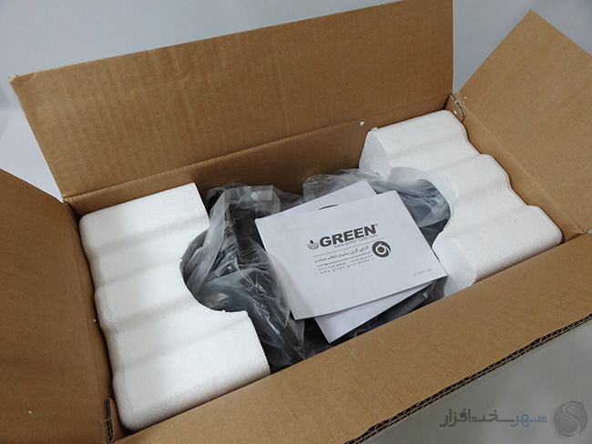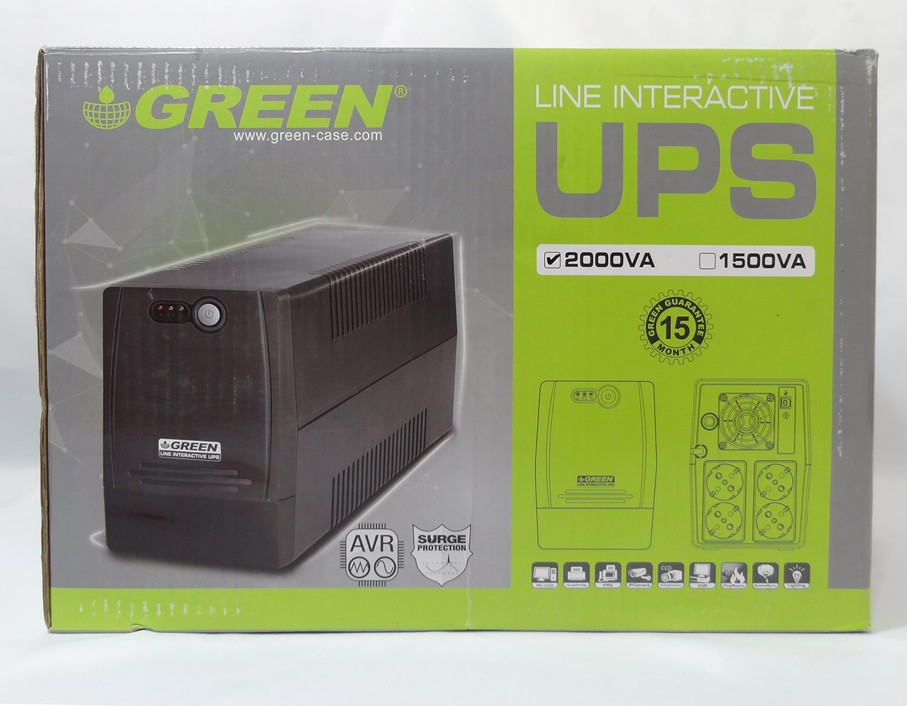 بر خلاف اغلب مدلهای مشابه موجود در بازار که جعبهای ساده و بیرنگ دارند، گرین از جعبهای با پس زمینه خاکستری در کنار رنگ سبز برای این مدل استفاده کرده است. بر روی جعبه تصویری بزرگ و البته باکیفیت از دستگاه UPS چاپ شده و در کنار آن لوگوی تجاری شرکت GREEN، نشانهای مربوط به تجهیز این دستگاه به استابلایزر داخلی، محافظت در برابر ولتاژهای لحظهای و همچنین برخی دستگاههای سازگار با این یو پی اس به همراه 15 ماه گارانتی و وکتورهای نشان دهنده پنل جلویی و پشتی دستگاه سایر مندرجات روی جعبه محسوب میشوند.