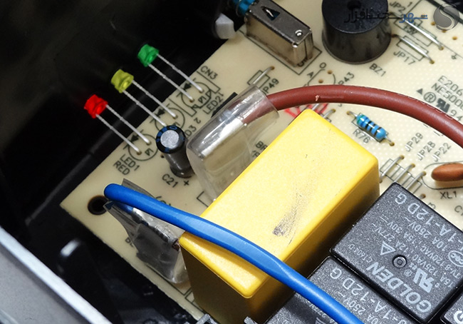 در تصویر بالا ترانسفورماتور افزاینده این دستگاه مجهز به دو خروجی مجزا جهت افزایش و کاهش ولتاژ در سناریوهای دوم و سوم ذکر شده را مشاهده میکنید.