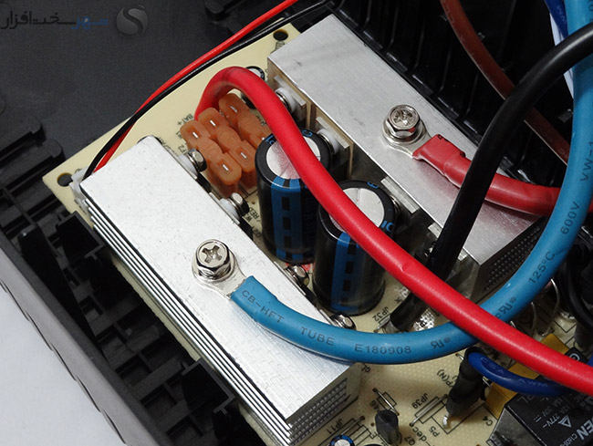در تصویر بالا نیز ترمینال مخصوص خروجی اینورتر این مجموعه را ملاحظه میکنید. از آنجا که خروجی اینورتر این UPS از نوع 12V AC است در حالت لود کامل ممکن است جریان خروجی در این ترمینال تا بیش از 100A نیز افزایش یابد. به همین دلیل در این بخش از سیمهای قطور و ترمینال مخصوص پیچ شده بر روی هیتسینک استفاده شده است.