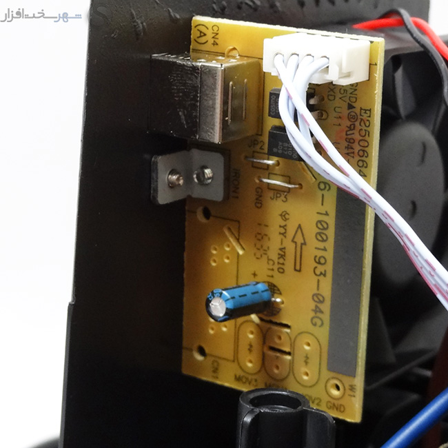 کانکتور سفید رنگ 4 پین تعبیه شده در سمت چپ این بازر وظیفه تأمین ولتاژ 5 ولت و ارسال اطلاعات از میکروپروسسور هوشمند این یو پی اس به USB Host Controller را بر عهده دارد. کانکتور 2 پین تعبیه شده در گوشه پایین و سمت چپ این برد نیز انرژی مورد نیاز فن 12V این دستگاه را تأمین میکند. لازم به ذکر است فن این دستگاه فاقد کنترلر فن بوده و در وضعیت عملیاتی با حداکثر سرعت (4000RPM) کار میکند. علاوه بر این یکی از قابلیتهای خاص این دستگاه عدم فعالیت آن در صورت از کار افتادن و یا قطع اتصالات مربوط به فن میباشد. این امر در عمل موجب تضمین عملکرد و افزایش ایمنی دستگاه در چنین شرایطی خواهد شد.