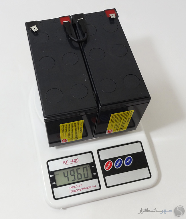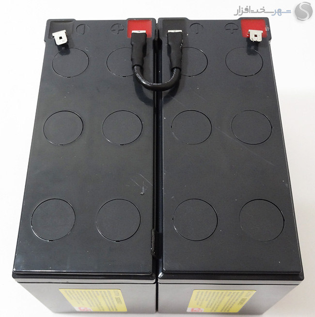 این دو باتری 12V که در عمل بهصورت سری (با ولتاژ 24V) به مدار اینورتر این یو پی اس متصل شدهاند به گفته کمپانی سازنده بیش از 260 بار قابلیت شارژ و دشارژ کامل و همچنین عمر بیش از 5 سال در حالت آماده به کار دارند. رنج دمای محیط عملیاتی این باتریها بین ℃40+ ~ ℃15- است و در دمای ℃25 بهترین عملکرد و طول عمر برای آنها پیش بینی شده است.