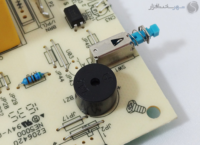 در تصویر بالا بازر مشکی رنگ تعبیه شده در سمت راست PCB را ملاحظه میکنید که وظیفه پخش هشدارهای صوتی در این UPS را بر عهده دارد. همچنین سویچ خاموش و روشن این دستگاه نیز دقیقاً در بالای این بازر تعبیه شده است.