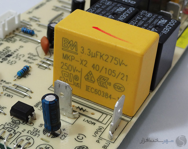 در تصویر بالا خازن 3.3uf از نوع Polypropylene (پلیپروپیلن) به کار رفته در بخش ورودی این UPS را مشاهده میکنید. این خازن در عمل مانع از ورود جریانهای لحظهای و گذرا (Surge and Transient Protection) به تجهیزات متصل شده به خروجی دستگاه شده و بخشی از فیلتر EMI و RF ورودی را نیز تشکیل میدهد.
