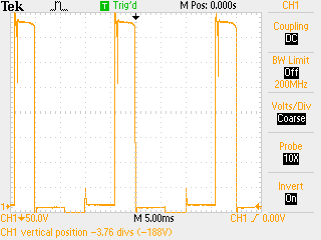 در تصویر بالا نیز نیم موج بالا شبه سینوسی خروجی اینورتر را ملاحظه میکنید. شکل موج فوق تا حدودی شبیه به موج مربعی است ولی در کل تمیز و در مقایسه با مدلهای مشابه قابل قبول به نظر میرسد. توجه داشته باشید همانطور که اشاره شد بهصورت کلی یو پی اس های با شکل موج خروجی شبه سینوسی برای تغذیه وسایل الکترونیکی حساس مانند تجهیزات آزمایشگاهی و ابزار دقیق مناسب نیستند.