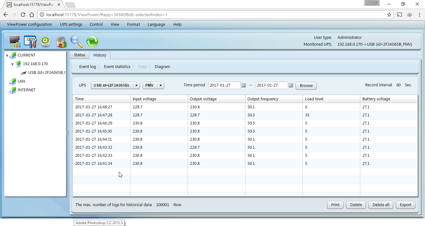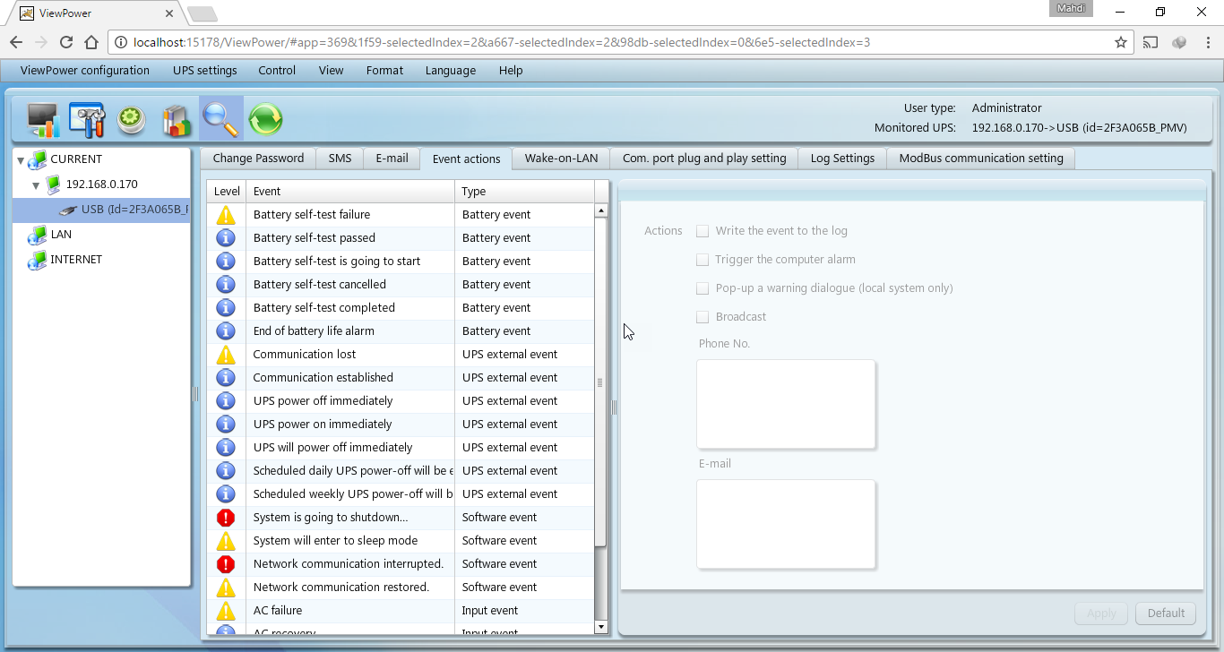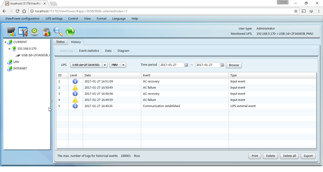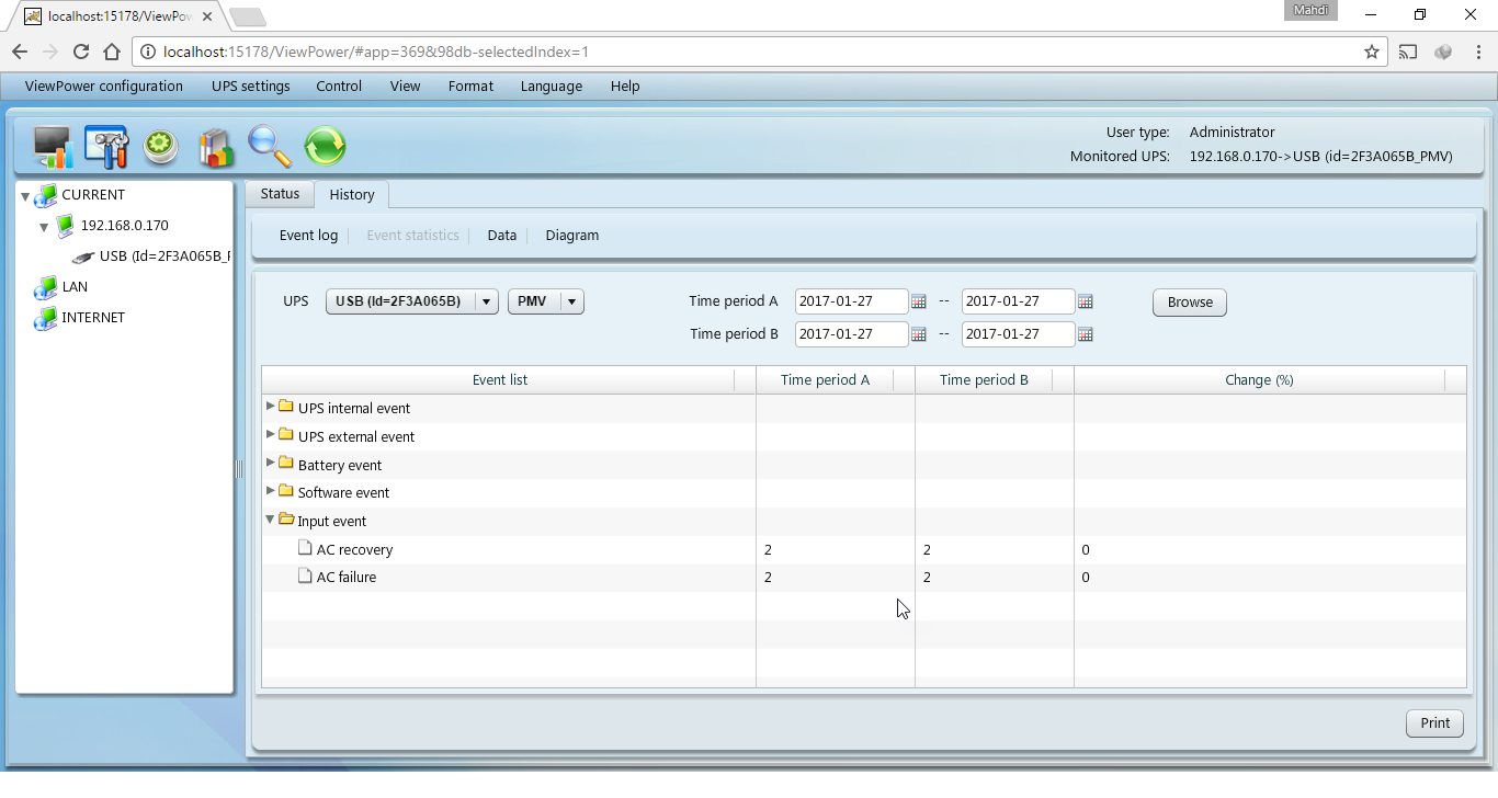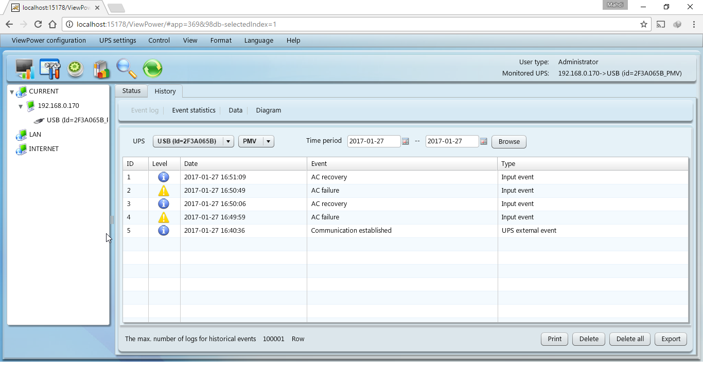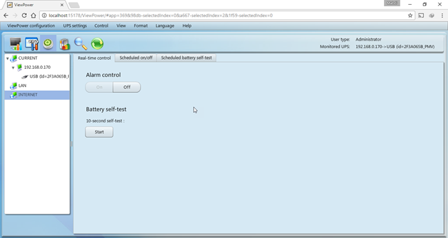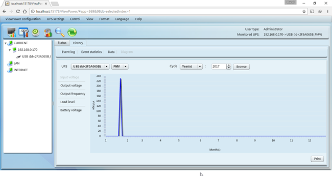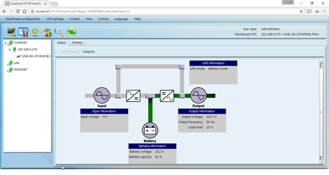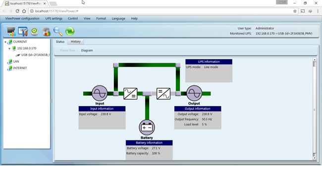 این نرم افزار بهگونهای تحت مرورگرهای وب اجرا میشود و البته سرور این نرم افزار همواره در بخش system tray فعال و در حال ثبت رویدادهای مختلف مرتبط با دستگاه UPS است. همانطور که در تصویر بالا ملاحظه میکنید با اجرای نرم افزار بهصورت پیش فرض پنجره مربوط به Status (وضعیت بر خط دستگاه) باز میشود. دیاگرام در نظر گرفته شده در این بخش بسیار ساده و البته اطلاعاتی کاربردی مربوط به مسیرهای ورودی تا خروجی برق در وضعیتهای مختلف، مسیر و میزان شارژ باتری، سطح ولتاژ باتریها، ولتاژ برق ورودی و خروجی و همچنین درصد زیر بار بودن دستگاه را بهصورت بر خط گزارش میکند.