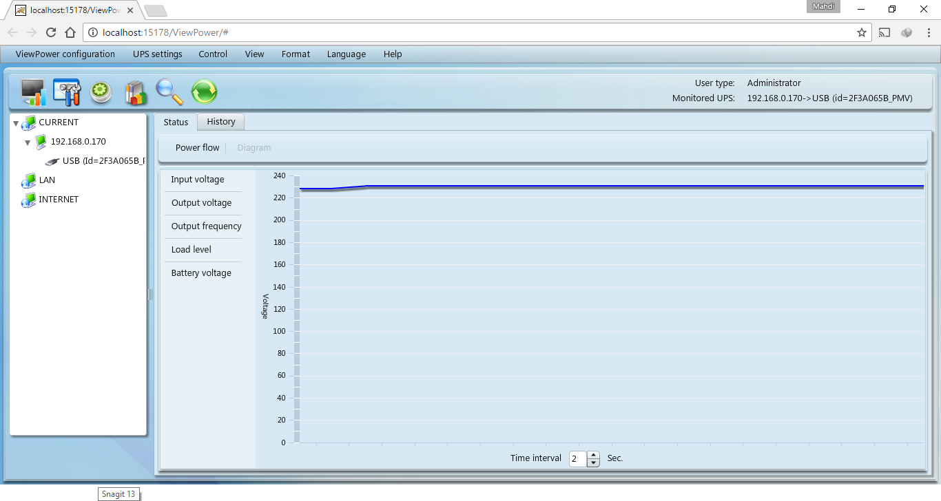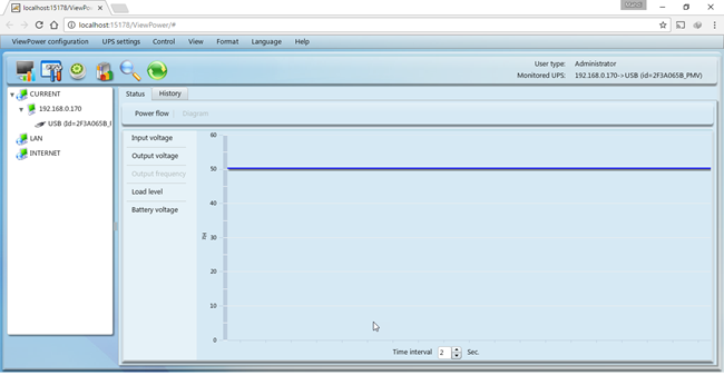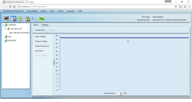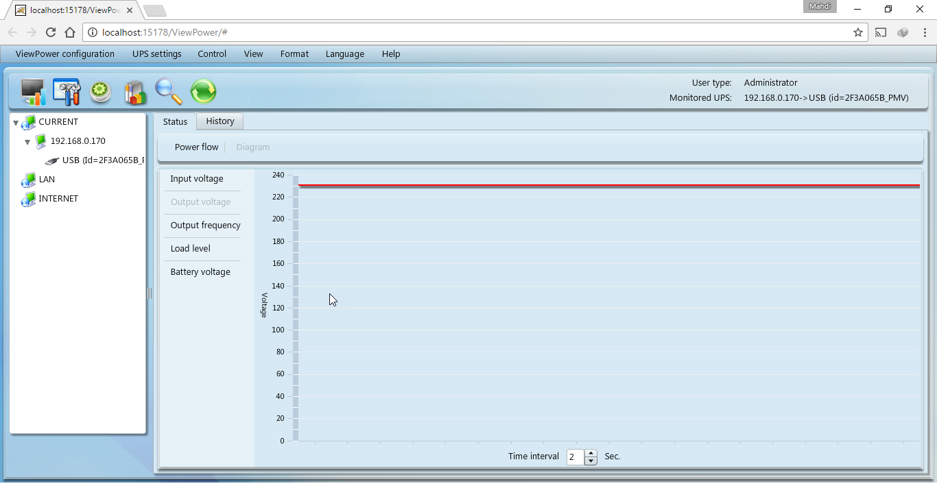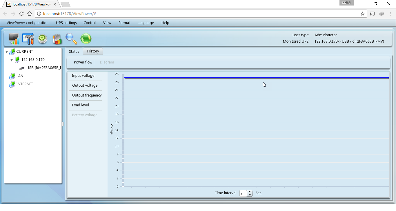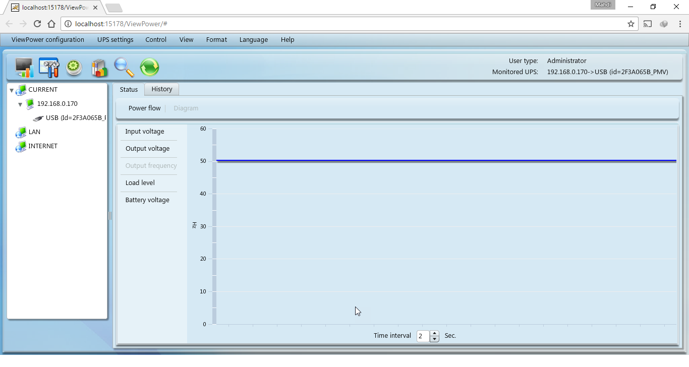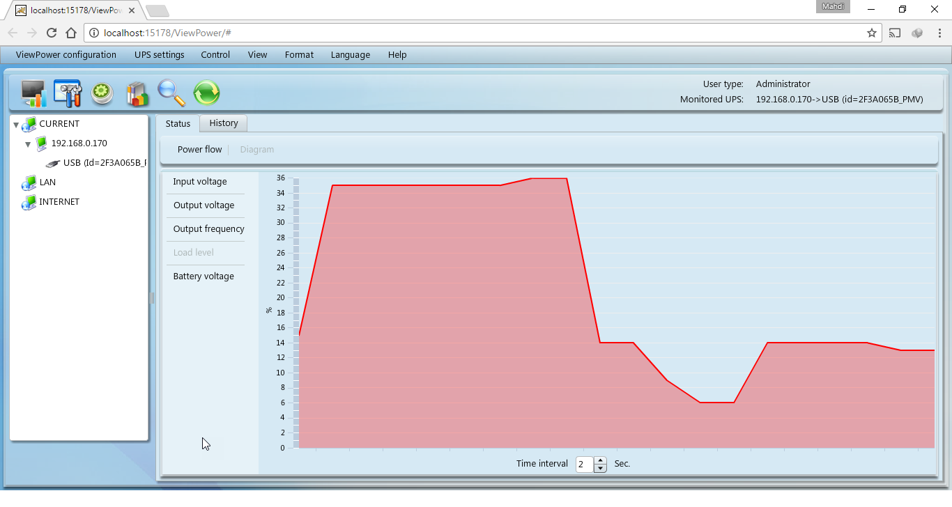 در بخش Diagram همان منوی Status این امکان فراهم شده تا با سرعتهای بهروزرسانی مختلف، تغییر مؤلفههای مختلف مانند ولتاژ ورودی و خروجی، فرکانس برق شهر، میزان بار بر روی دستگاه و همچنین سطح ولتاژ باتری را بهصورت برخط مشاهده کرد.
