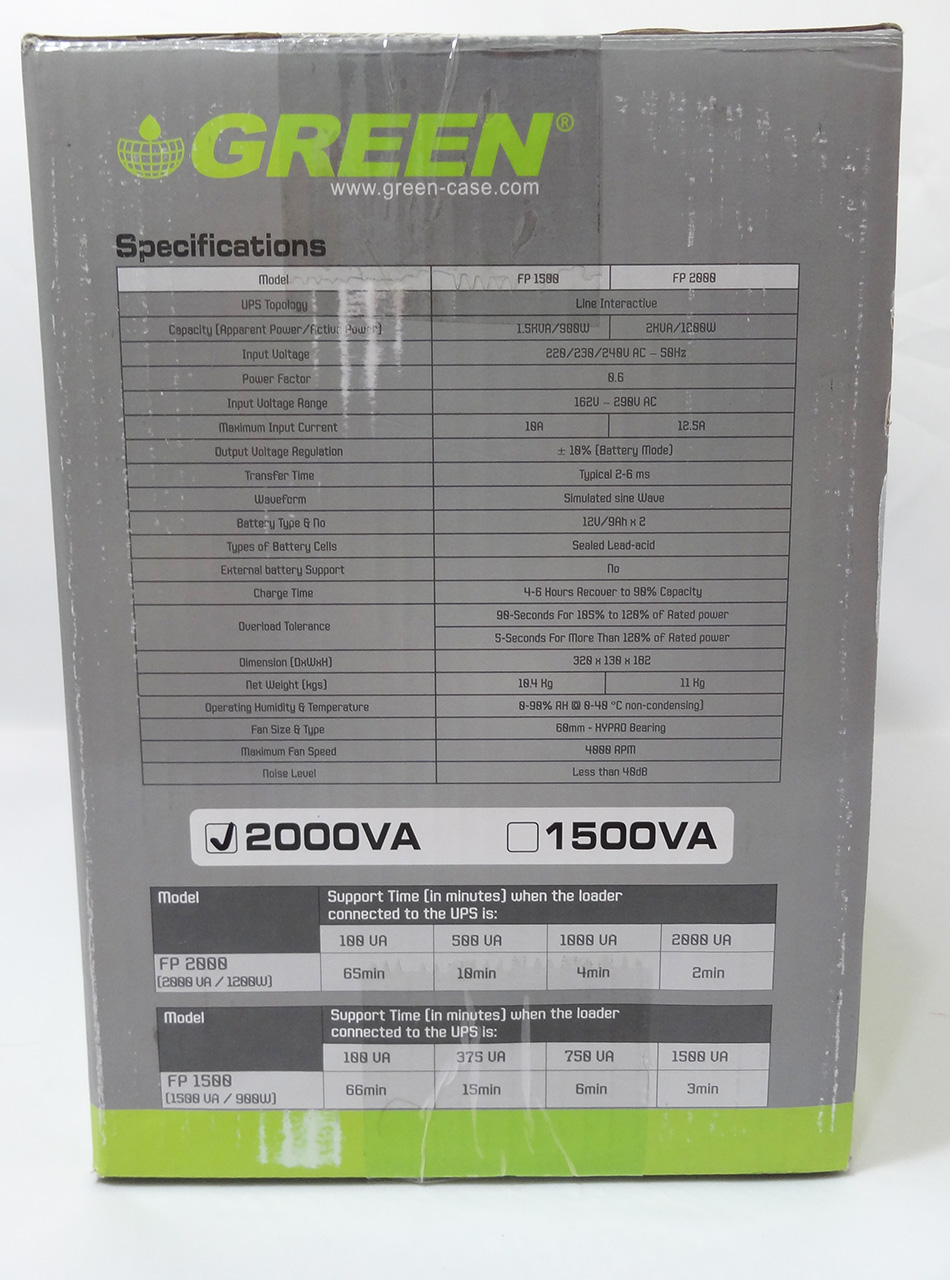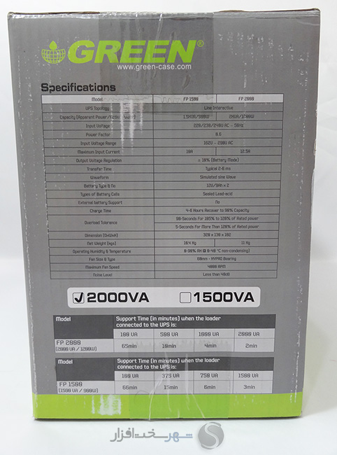 مشخصات فنی این محصول بهصورت کامل در وجه دیگر این جعبه چاپ شده و علاوه بر این میزان تقریبی زمان بک آپ باتری نیز در بارهای مختلف برای هر دو مدل بهصورت مجزا عنوان شده است. این در حالی است که اغلب سازندگان دستگاههای UPS به دلایل مختلف از درج این مشخصات خودداری میکنند!