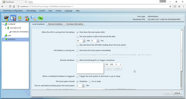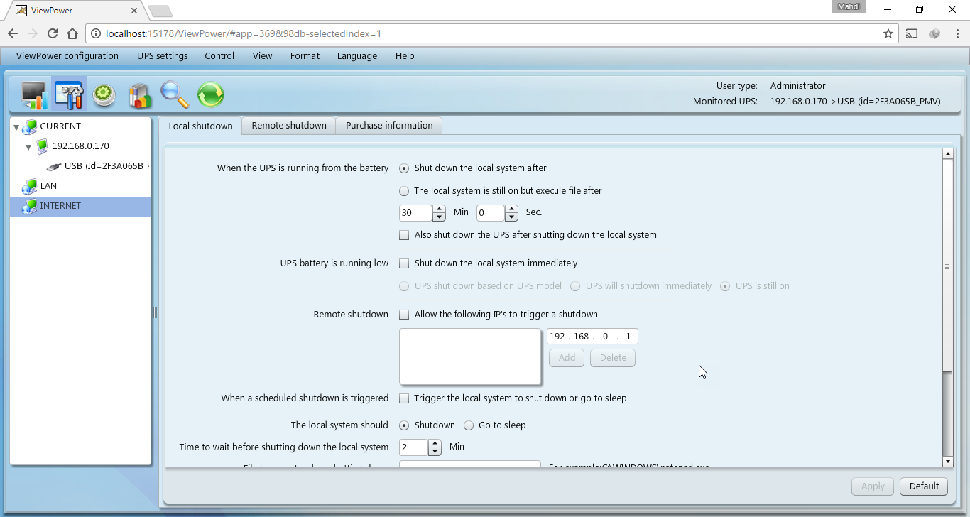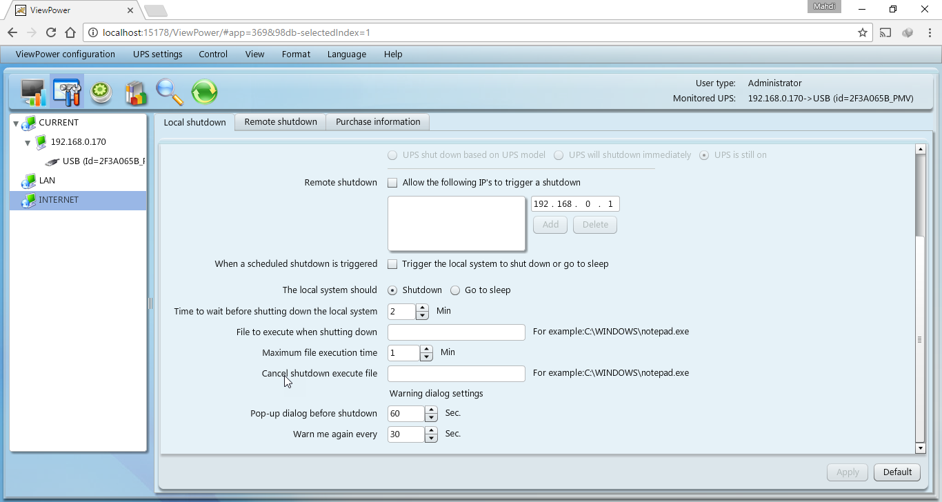 اما وارد تنظیمات این نرم افزار که بشوید در حالت پیش فرض در بخش Local Shutdown این قابلیت تنظیم شده تا بعد از گذشت از 30 دقیقه پس از قطع برق شهر دستگاه بهصورت خودکار دستور Shutdown سیستم عامل را اجرا کنید. البته این قابلیت امکان غیرفعال شدن را نیز دارد.