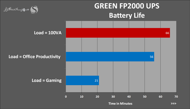 در تست دوم که شبیه ساز مصرف انرژی یک سیستم مدرن و رده بالا در تست های Office Productivity بود نیز نتیجه ثبت شده 56 دقیقه عالی به نظر میرسد. طبق محاسبات ما این UPS بهراحتی توانایی تغذیه 3 الی 4 سیستم میان رده را در ادارات کوچک به مدت بیش از 20 دقیقه دارا خواهد بود.