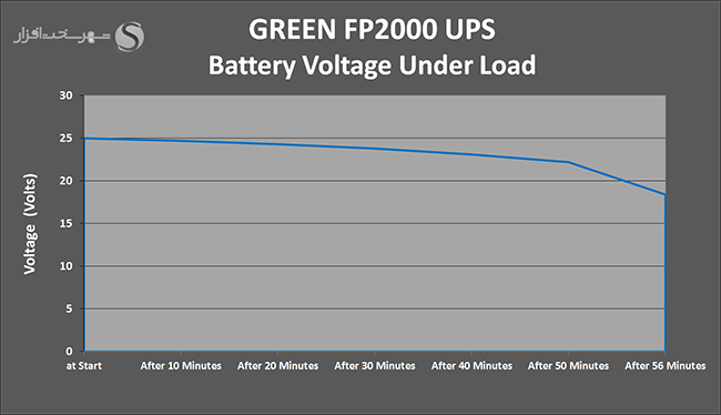 در تصویر بالا، نمودار افت ولتاژ باتری زیر بار تست Office Productivity را ملاحظه میکنید. مشخص است که ولتاژ باتریها دقیقاً پس از قطع برق شهر و وارد شدن اینورتر به مدار از 25V شروع شده، پس از 50 دقیقه به حدود 22.5V رسیده و در نهایت با اتمام ظرفیت باتری در 18.4V میکروپروسسور هوشمند یو پی اس دستور خاموش شدن دستگاه را صادر کرده است.