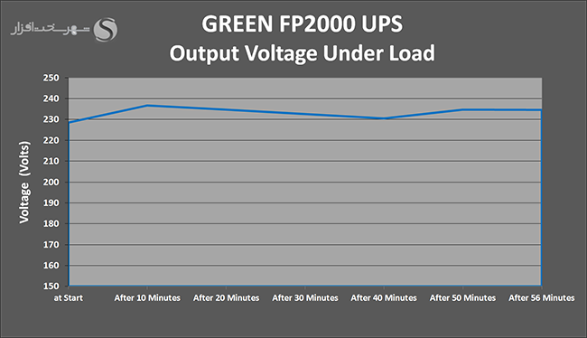 همانطور که اشاره شد یکی از قابلیتهای UPS مدل FP2000 تجهیز آن به استابلایزر داخلی است. در قدم دوم با استفاده از یک واریاک AC اقدام به کاهش و افزایش ولتاژ AC برق شهر کردیم تا عملکرد استابلایزر این دستگاه را به چالش بکشیم. در ابتدا اقدام به کاهش ولتاژ کردیم و در ولتاژ حدود 205V حالت Boost استابلایزر فعال و ولتاژ خروجی بار نیز به حدود 239V افزایش یافت. همزمان با فعال شدن استابلایزر فن دستگاه نیز روشن و با حداکثر سرعت شروع به فعالیت میکند. در این وضعیت حداکثر نویز صوتی سنجیده شده توسط دستگاه Sound Meter در فاصله 1.5 متری دستگاه حداکثر 43dB ثبت شد. این میزان نویز صوتی در محیطهای اداری کاملاً عادی به نظر میرسد ولی شاید برای استفاده در منزل برای برخی کاربران خوش آیند نباشد. البته این میزان نویز تقریباً برای تمامی UPS های مشابه در این رنج توان وجود دارد و تنها مختص این مدل نیست. البته این موضوع را نیز در نظر داشته باشید که در وضعیت عادی برق شهر فن این دستگاه همواره خاموش است؛ اما از بحث اصلی بیش از این فاصله نگیریم. در ادامه کاهش ولتاژ را ادامه دادیم و در این حالت در ولتاژ ورودی حدود 167V (ولتاژ خروجی AVR در این وضعیت حدود 200V ثبت شد) کنترلر هوشمند دستگاه، AVR را از مدار خارج و با قطع برق ورودی، انرژی ذخیره شده در باتری و جریان متناوب تولید شده توسط اینورتر را به بار منتقل کرد. پس تا اینجا ولتاژهای بین 10% الی 27% کمتر از مقدار نامی (230V) توسط AVR دستگاه قابل اصلاح خواهد بود؛ اما در ادامه اقدام به افزایش ولتاژ کردیم. در این حالت در حدود ولتاژ ورودی 247V استابلایزر در وضعیت Buck وارد مدار شد و سطح ولتاژ خروجی را تا 210V کاهش داد. با افزایش بیشتر ولتاژ ورودی نهایتاً در ولتاژ 274V (ولتاژ خروجی در این وضعیت 238V ثبت شد) AVR نیز از مدار خارج و UPS به حالت Battery Mode رفت. در این حالت نیز ولتاژهای بین 7% الی 19% بیشتر از مقدار نامی توسط AVR قابل تصحیح هستند. بهطور کلی رنج ولتاژ قابل تصحیح و سرعت عمل AVR این دستگاه با توجه به قیمت آن فراتر از حد تصور ما بود و از این حیث میتوان نمره قبولی برای آن در نظر گرفت.