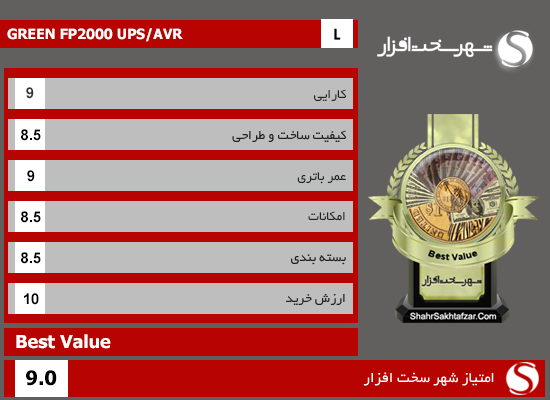 با تمامی این تفاسیر یو پی اس "GREEN FP2000" موفق به کسب امتیاز ممتاز 9.0، نشان "Best Value" و ریز امتیازات زیر در کلاس محصولات (L (Low-End از لابراتوار شهر سخت افزار شد.