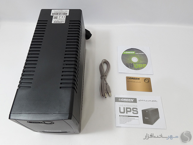 محتویات داخل جعبه نیز شامل دستگاه UPS، دفترچه راهنمای نصب و راه اندازی، CD حاوی نرم افزار مانیتورینگ View Power II، کارت گارانتی و کابل USB 120CM جهت اتصال UPS به PC میباشد.