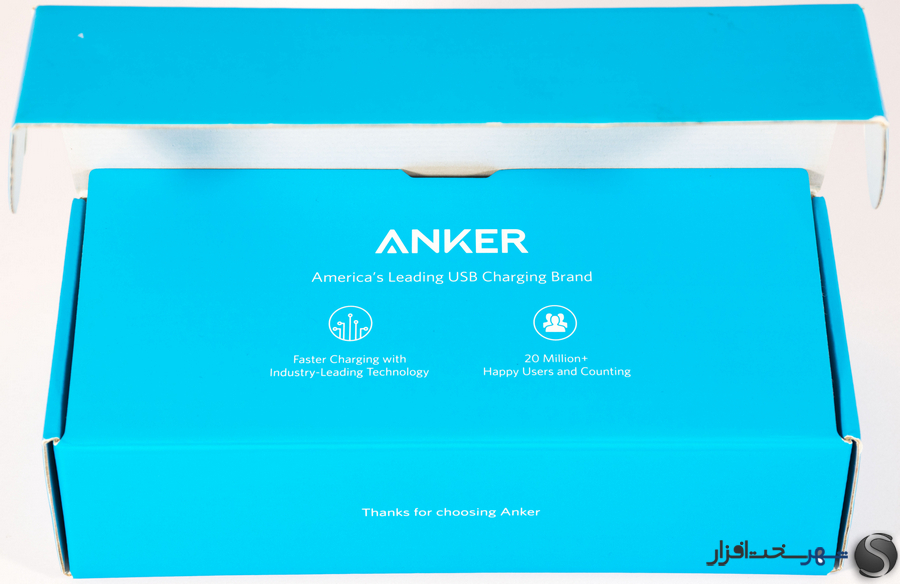 با باز کردن جعبه یک پوشش مقوایی دوم را مقابل خود یافتیم بر روی آن تاکید شده Anker برند نخست شارژر در آمریکا است. همچنین به وجود بیش از 20 میلیون خریدار خشنود اشاره شده، چیزی که ما نمیتوانیم آن را تأیید کنیم. اینجا نیز شاهد تاکید Anker بر وجود فناوریهای افزایش دهنده سرعت شارژ هستیم. "از انتخاب Anker متشکریم"