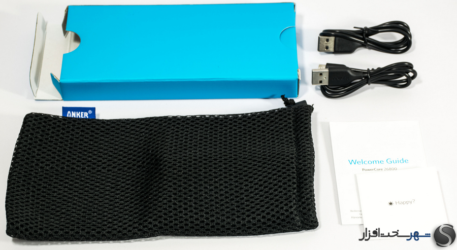 خود پاور بانک داخل یک پوشش پلاستیکی قرار دارد اما زیر آن یک جعبه ثانویه یافت میشود که متعلقات آن را در خود جای داده است.