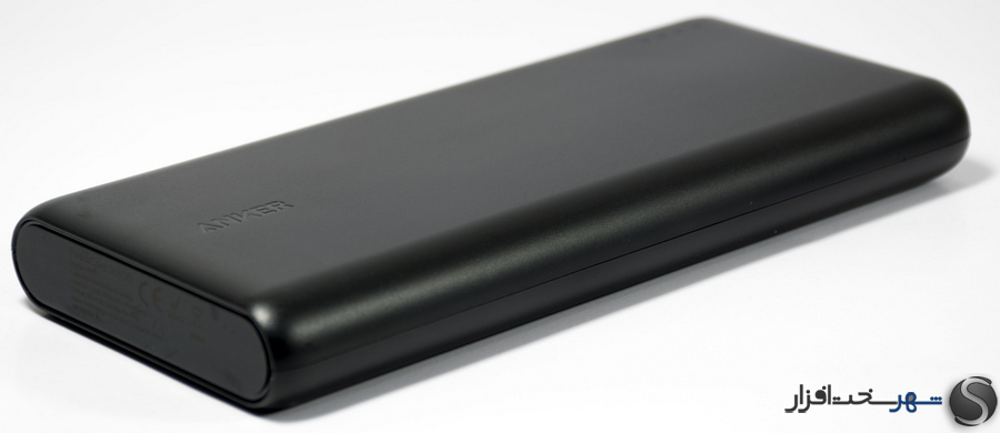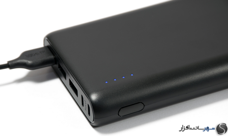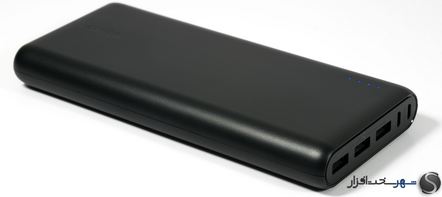 یک سمت پاور بانک میزبان لوگوی کنده کاری شده Anker و نشانگر وضعیت شارژ است.