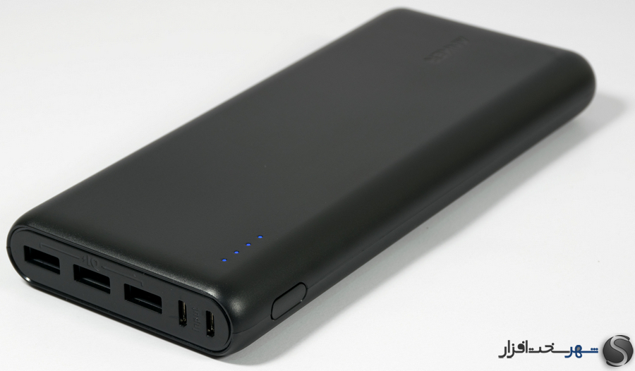 در لبه سمت راست پاور بانک چهار عدد نشانگر LED آبی تعبیه شده که وضعیت شارژ باتری را نشان میدهد. هر چراغ نشان گر 25 درصد ظرفیت یا به عبارتی 6700 میلی آمپر ساعت (اسمی) است، مطمئناً ظرفیت موثر قدری متفاوت خواهد بود.