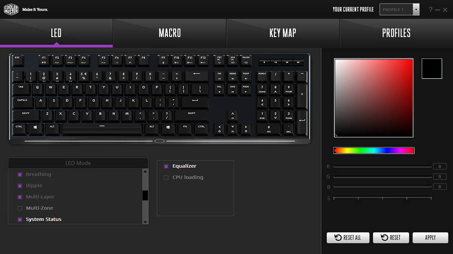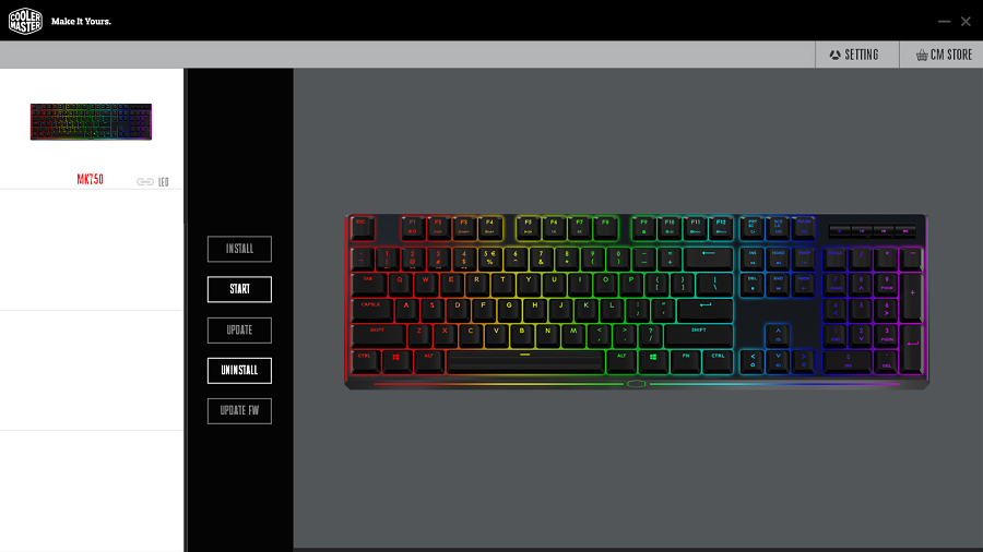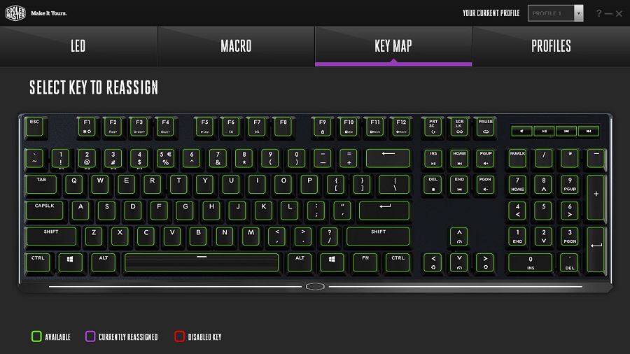 به کمک برنامه Cooler Master Portal می توان برنامه مکمل اختصاصی ساخته شده برای این کیبورد را دریافت و اجرا کرد. همچنین امکان به روزرسانی Firmware نیز وجود دارد. با این حال به طرز عجیبی این برنامه فاقد هرگونه اسم مشخص است. همچنین اجرای آن زمان بر است. لازم به ذکر است از طریق منوی کشویی بالای پنجره می توان تنظیمات هر بخش را برای همان پیکربندی تغییر داد.