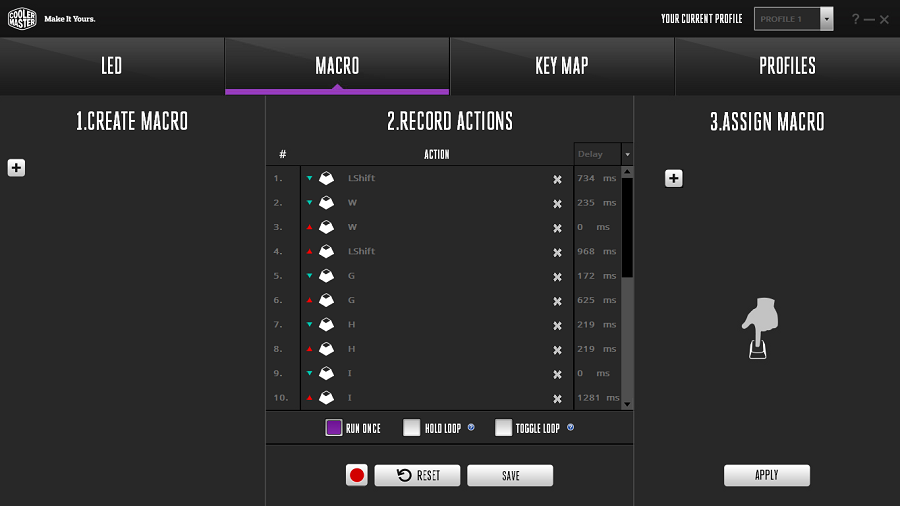 کولرمستر در این کیبورد نیز سیستم شخصی سازی موسوم به On-the-fly را پیاده سازی کرده که شخصی سازی آن بدون نیاز به اجرای برنامه مکمل را ممکن می کند. در واقع کاربر می تواند در حین استفاده از کیبورد، با بهره گیری از کلیدهای ترکیبی تعریف شده تنظیمات و تغییرات مورد نظر خود را انجام دهد. برای دسترسی به پیکربندی های شخصی سازی شده نیز می توان از ترکیب کلید FN با هر یک از کلیدهای P1 تا P4 استفاده کرد. برای خروج از حالت پیکربندی های شخصی سازی شده FN+ESC را باید فشرد. اما اگر کاربر بخواهد ماکرو ضبط کند، فشردن کلید FN با F11 او را به هدف خود می رساند. ترکیب FN با F12 نیز امکان حذف ماکروها را می دهد.