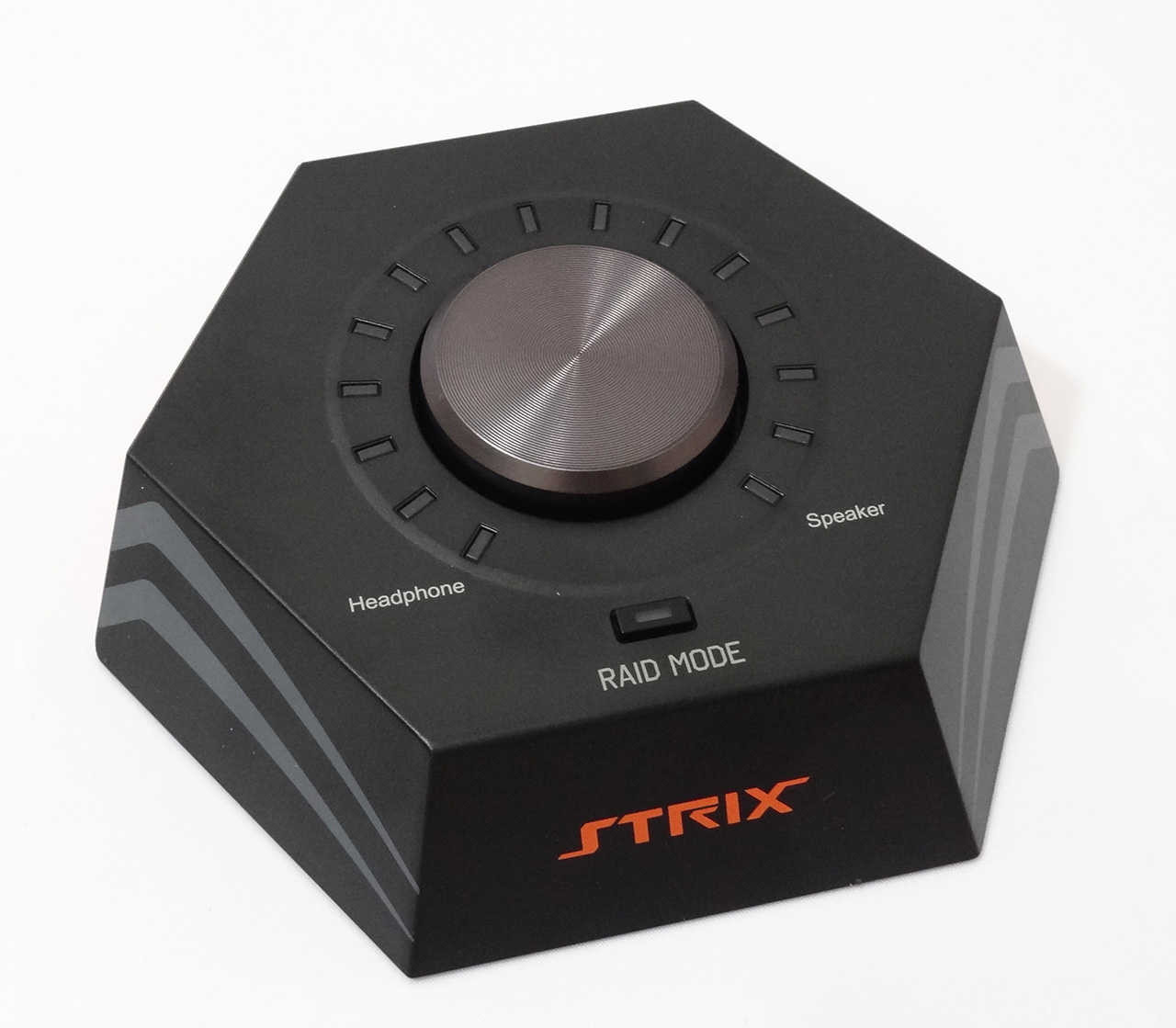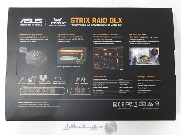اگر تنها از بعد سخت افزاری به کارت صدای گیمینگ ASUS STRIX RAID DLX نگاه کنیم، باید خالق آن را تحسین کنیم. ASUS در طراحی و انتخاب کامپوننت های آکوستیک مدرن حال حاضر دنیا برای این کارت صدا چیزی کم نگذاشته است. استفاده از خازنهای مخصوص ادوات صوتی سری FG، KZ و KT ساخت کمپانی ژاپنی Nichicon در بخش فیلتر و تغذیه آمپلیفایر هدفون، استفاده از خازنهای گران قیمت و کمیاب ساخت کمپانی آلمانی WIMA در بخش فیلتر خروجیهای Center، Front و Rear، استفاده از بهترین تراشههای DAC و ADC ساخت کمپانیهای معروف آمریکایی با SNR و DNR بیش از 120dB به همراه پردازنده قدرتمند CM6632AX ساخت کمپانی باسابقه C-Media همگی جزو قطعاتی هستند که نظیر آنها اکثراً در سیستمهای صوتی رده بالا و اصطلاحاً Hi-Fi مشاهده میشوند. از سوی دیگر کنترل باکس این کارت صدای 7.1Channel نیز از دیگر نقاط قوت این محصول محسوب میشود. این کنترل باکس بسیار زیبا علاوه بر اینکه دسترسی به برخی تنظیمات و پروفایلهای آماده سطوح مختلف صدا را در سریعترین زمان فراهم میکند، سبب دسترسی سریع کاربر به ورودی و خروجیهای صدا میشود.