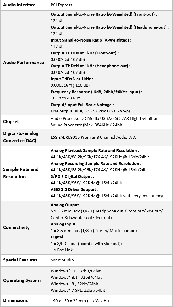 اگر حتی به صورت سطحی نیز با برخی از این پارامترها و تراشههای DAC و پردازندههای صوتی حرفه ای حال حاضر دنیا نیز آشنا باشید با یک نگاه به این جدول متوجه خواهید شد که حداقل روی کاغذ با یک کارت صدای فوقالعاده حرفه ای و کم نظیر روبرو هستید.