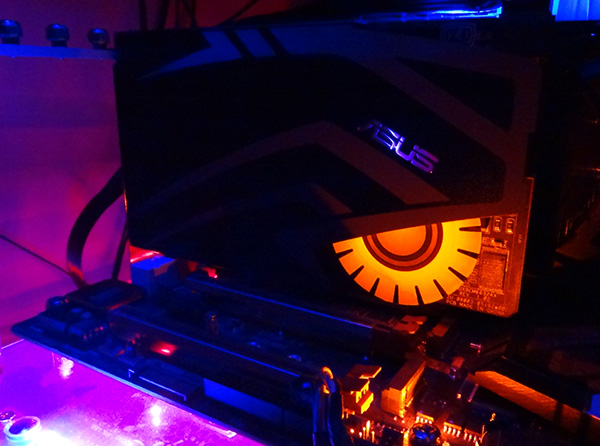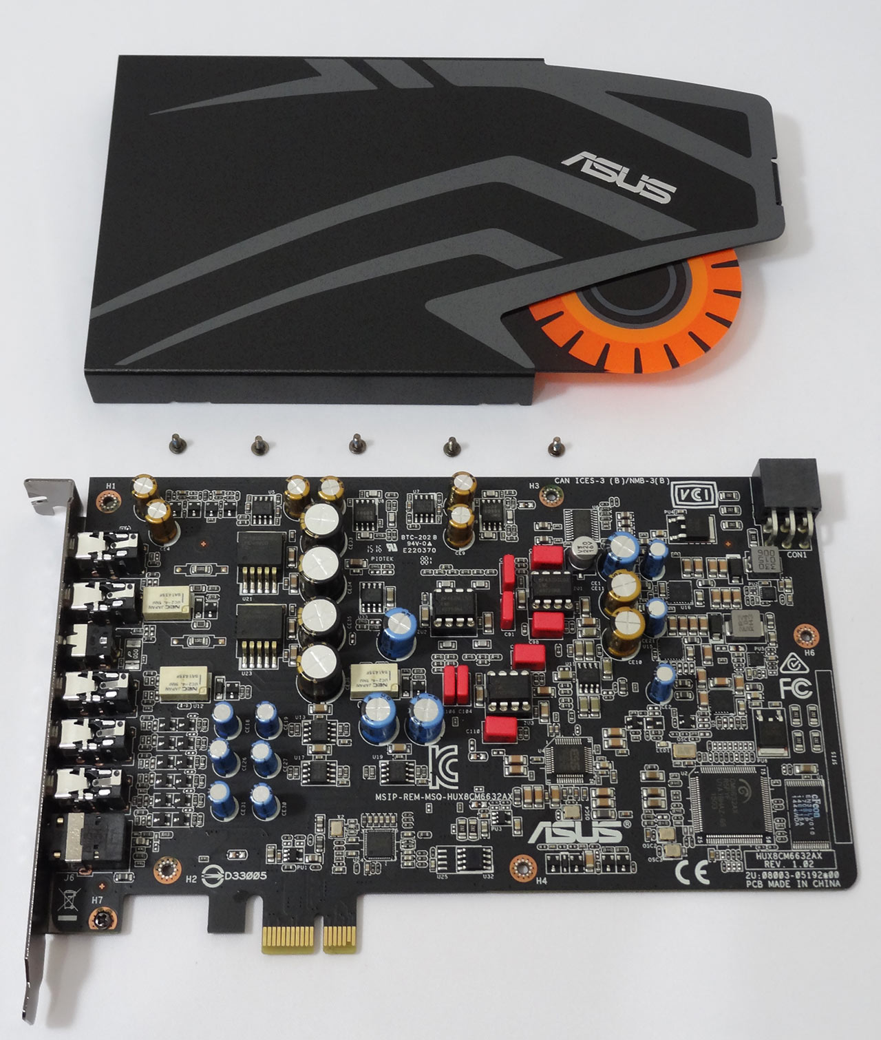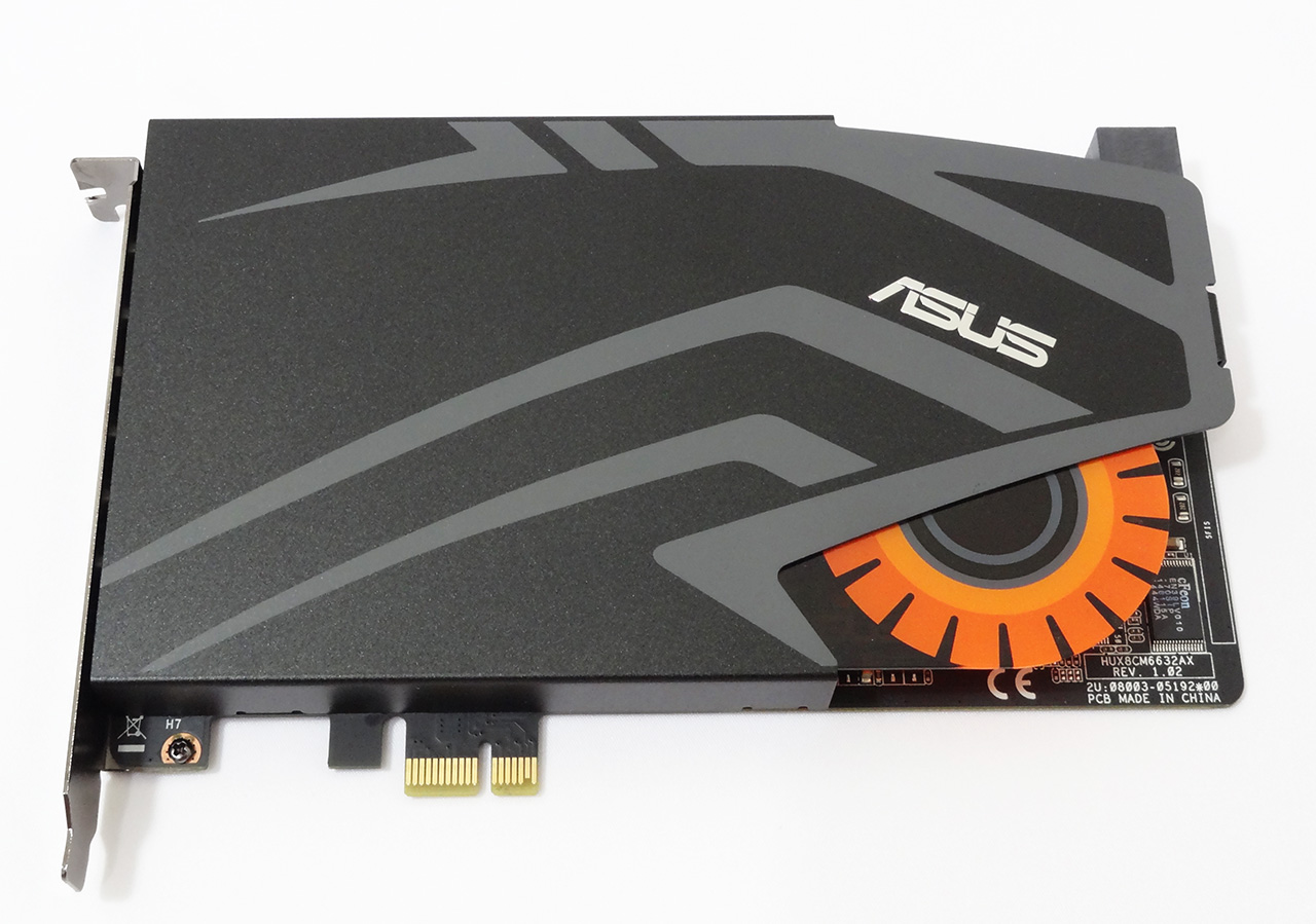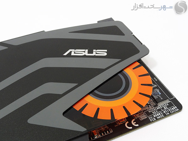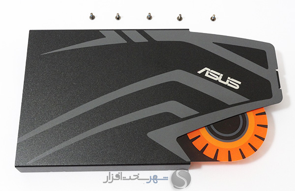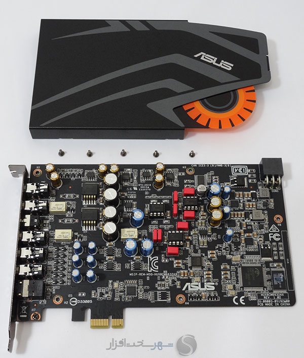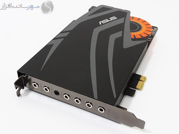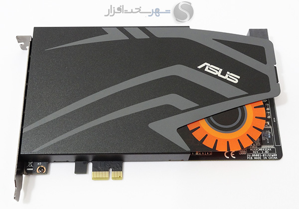 تعبیه لوگوی فلزی کمپانی ASUS به همراه لوگو زرد و نارنجی رنگ کارتهای صدای گیمینگ سری STRIX این کمپانی بر روی محافظ فلزی EMI مشکی رنگ همراه با طرحهای خاکستری چهرهای خاص و کم نظیر به این مدل بخشیده است.