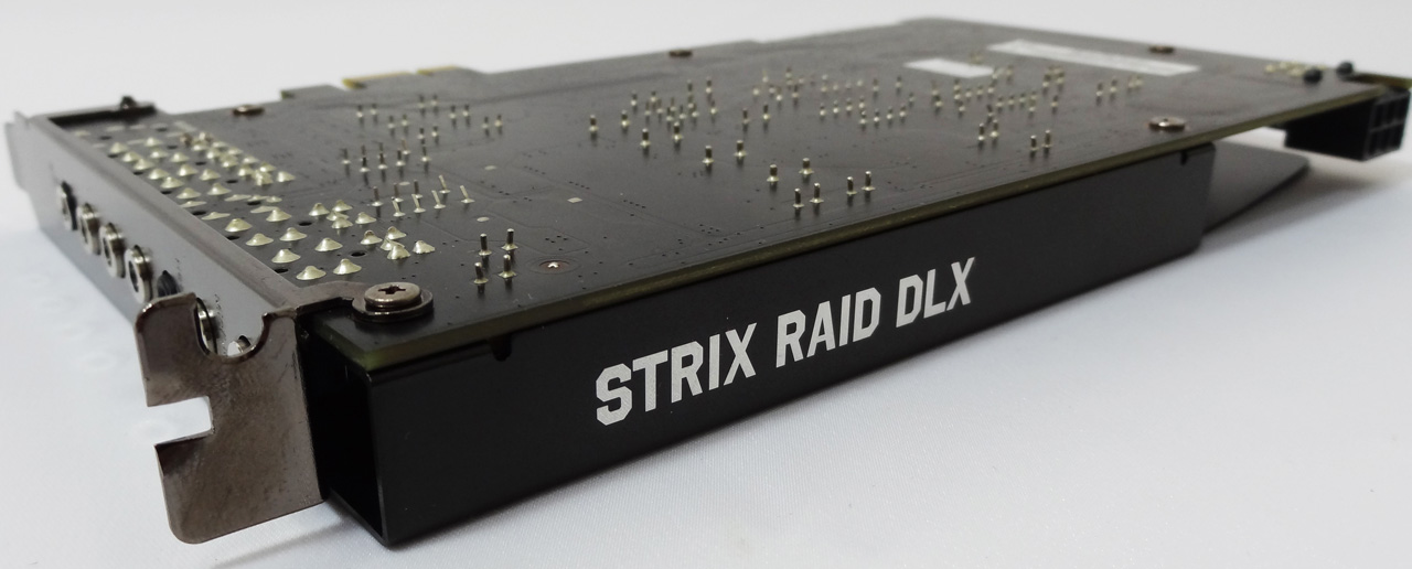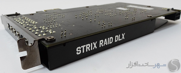 علاوه بر این، مدل تجاری این کارت صدا نیز در بخش فوقانی PCB و بروی محافظ EMI درج شده است. در واقع اگر از کیس های با درب شفاف استفاده میکنید مدل تجاری STRIX RAID DLX تنهای چیزی است که از ظاهر این مدل در معرض دید مستقیم خواهد بود.