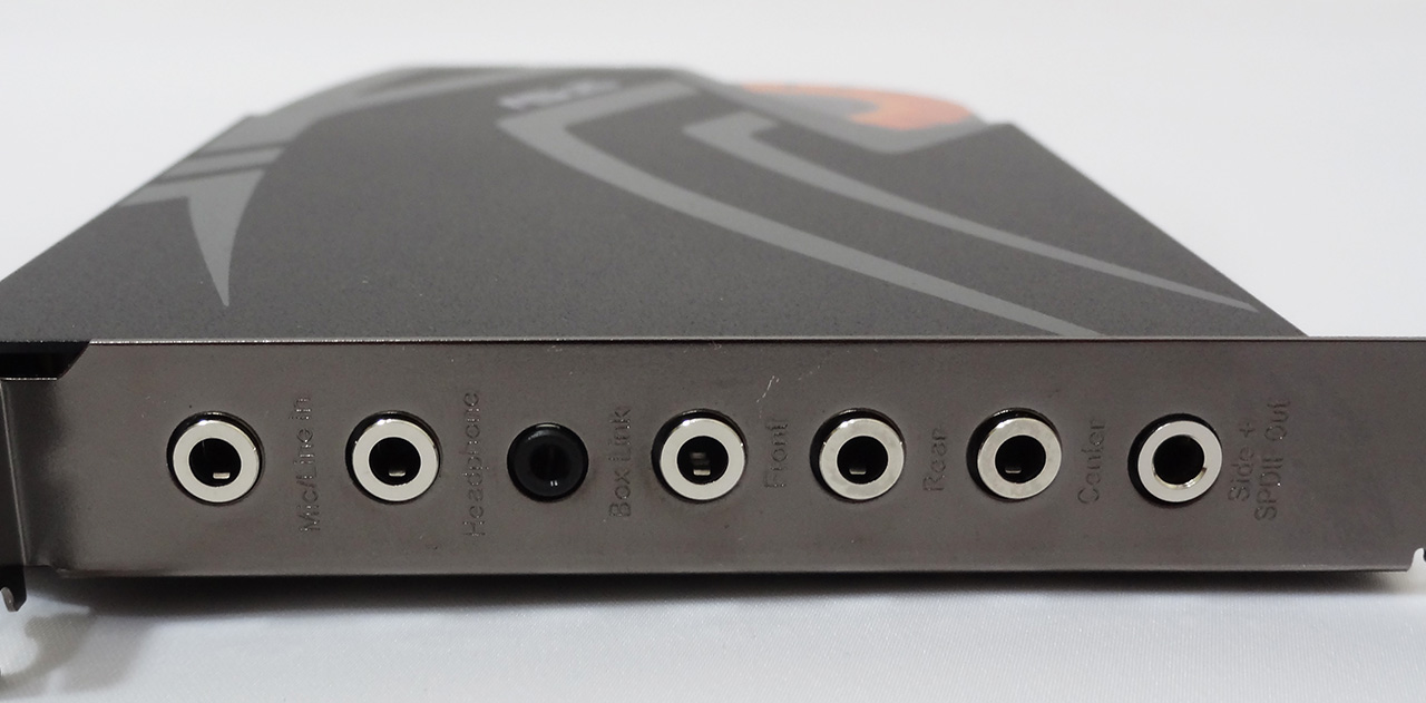 در پنل پشتی این کارت صدا نیز 5 جک 3.5mm و 1 جک مشکی رنگ 2.5mm تعبیه شده است. این کانکتورها به ترتیب از بالا برای اتصال به میکروفون و یا ورودی Line-in، هدفونهای حرفه ای، کابل مخصوص BOX LINK، بلندگوهای جلو، بلندگوهای عقب، بلندگوهای مرکزی و یا ساب ووفر تعبیه شدهاند. همچنین آخرین کانکتور نیز که خروجی دیجیتال از نوع Side+ S/PDIF Out محسوب میشود به واسطه مبدل TOSLINK و فیبر نوری جهت اتصال به سیستمهای صوتی حرفه ای نظیر سینماهای خانگی و آمپلیفایرهای حرفه ای استفاده میشود.