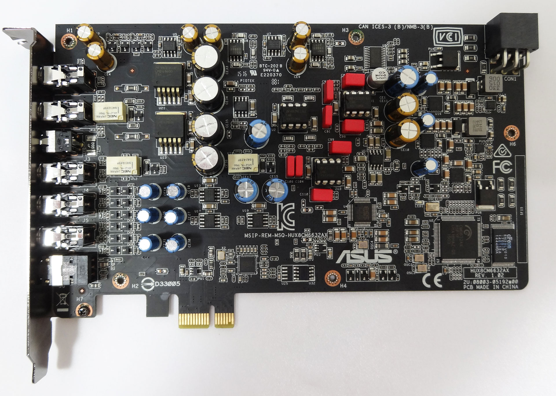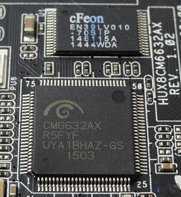 در تصویر بالا پردازنده صوتی مدل CM6632AX ساخت کمپانی C-Media و حافظه اختصاصی 1Mb آن را ملاحظه میکنید. این پردازنده قدرتمند که به صورت ذاتی دارای رابط USB 2.0 است قابلیت پردازش 10 کانال ورودی و خروجی صدا با مشخصات 24bit/ 192Hz را دارا است. این نوع ترکیب نوید از استقلال کامل این کارت صدا در پردازش صدا میدهد و این بدین معناست که در سیستمهای مجهز به این کارت صدا، CPU و حافظه اصلی سیستم نقش بسیار کم رنگ در پردازش صدا خواهند داشت.