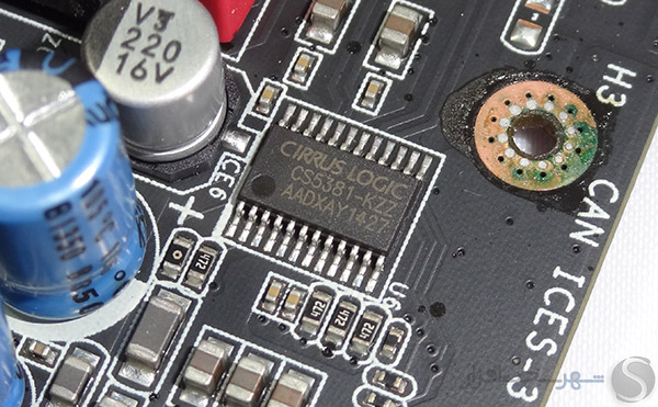 همانطور که ملاحظه میکنید به جهت جلوگیری از تأثیرات امواج الکترومغناطیسی ساطع شده از سایر قطعات سخت افزاری سیستم بر روی کارت صدا سرتاسر PCB این مدل توسط محافظ فلزی EMI پوشیده شده است.