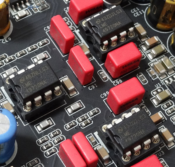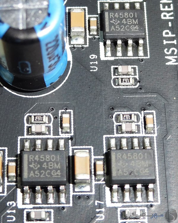 در تصویر بالا نیز Op-Amp های مدل LME49720 ساخت کمپانی آمریکایی Texas Instruments به کار رفته در مدار آمپلیفایر هدفون این کارت صدا را ملاحظه میکنید. پشتیبانی از امپدانس خروجی 600 اهم، THD حداکثر 0.00003%، توان خروجی 500mw و پشتیبانی از پروتکشن Short Circuit از جمله ویژگیهای کم نظیر این تقویت کنندههای عملیاتی با کیفیت محسوب میشوند.