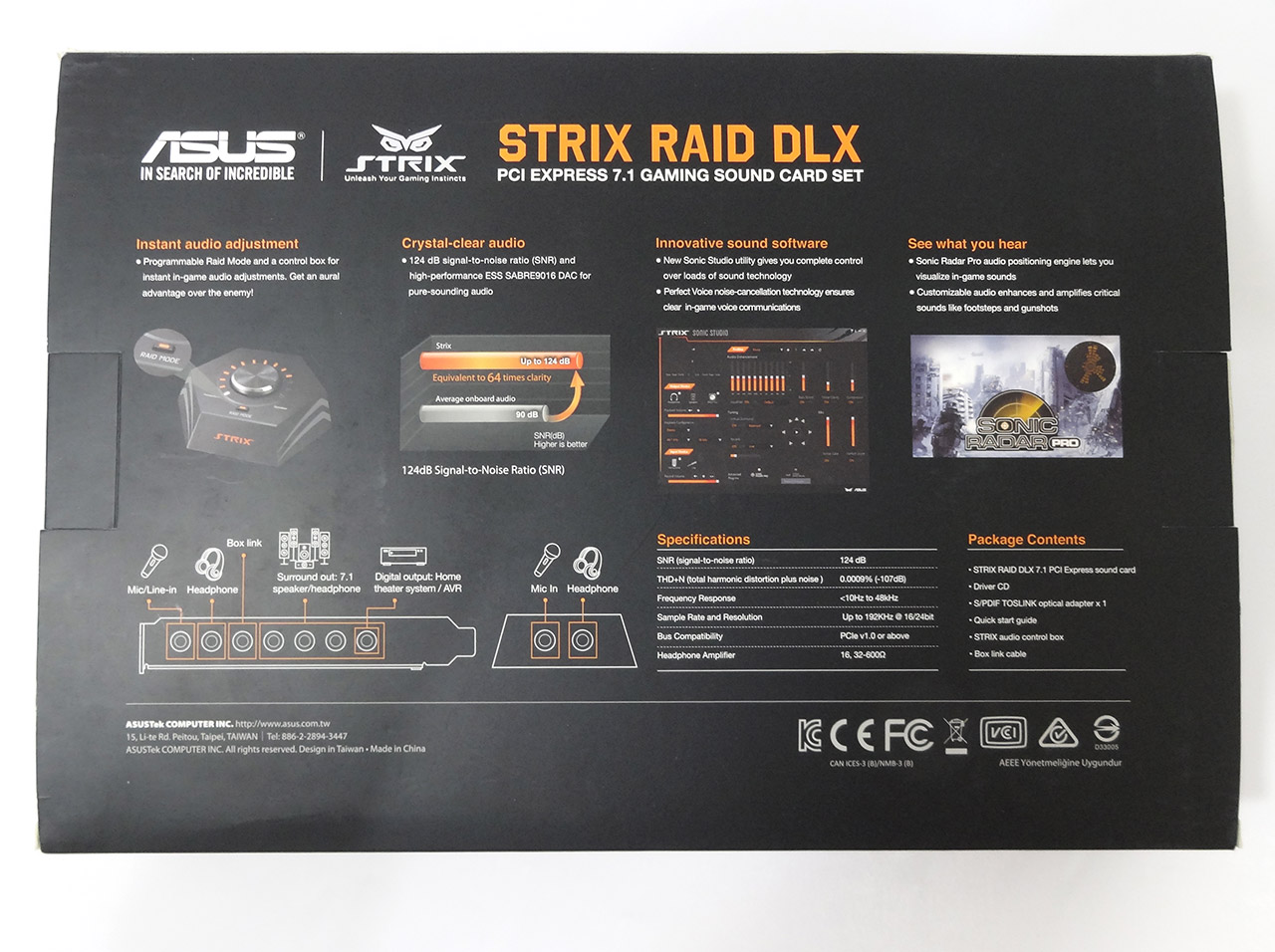 در پشت جعبه نیز سعی شده تا به صورت خلاصه به بیان محوریترین ویژگیها و قابلیتهای سخت افزاری و نرم افزاری پرداخته شود. همچنین مشخصات فنی، اشاره به محتویات داخل جعبه و تشریح عملکرد جکهای 3.5mm تعبیه شده بر روی پنل پشتی کارت و کنترل باکس سایر مندرجات این بخش را شامل میشوند.