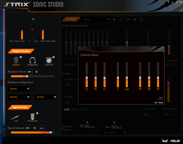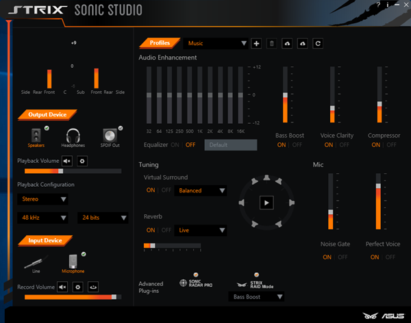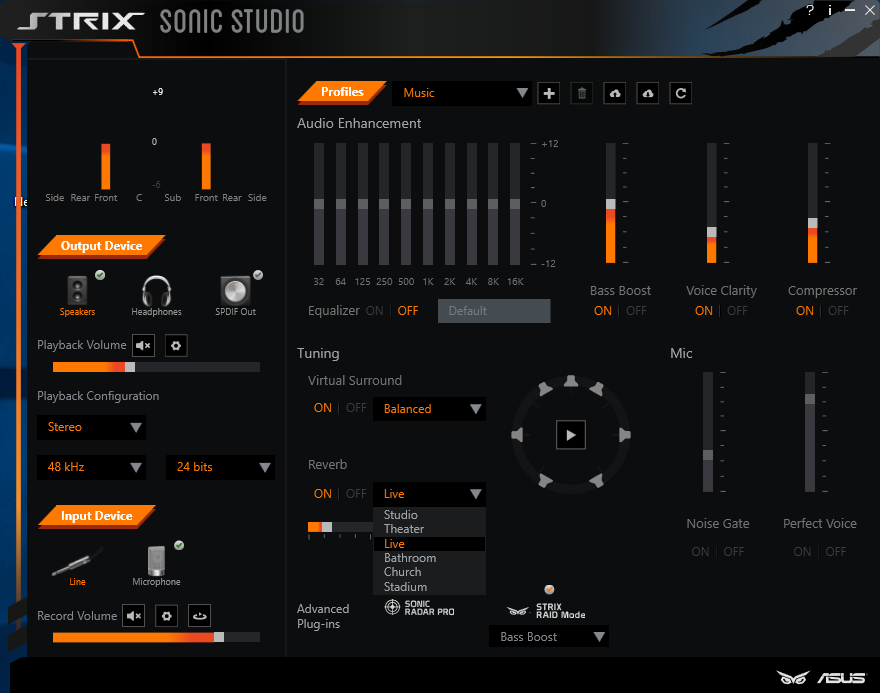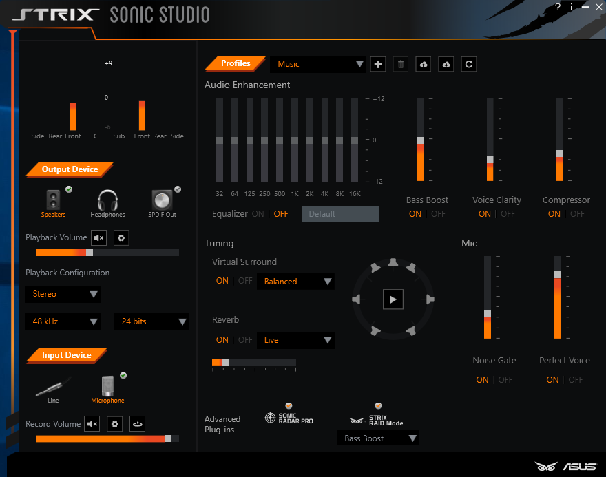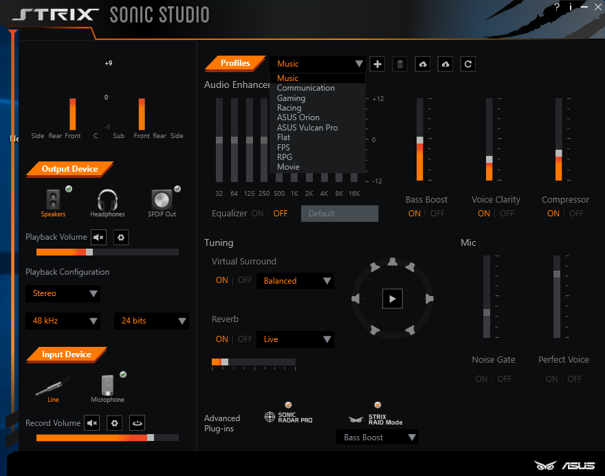 همانطور که ملاحظه میکنید تمامی امکانات این نرم افزار تنها در یک صفحه گردآوری شده و به طور کلی شامل امکاناتی مثل مانیتورینگ دستگاههای متصل و میزان حجم صدای خروجی، کیفیت نمونه برداری، Bit Rate و پیکربندی کانالهای خروجی، تعیین نوع ورودی، اکولایزر 10 باند، چندین پروفایل آماده برای محیطهای فیلم، موسیقی و گیمینگ، صدای فراگیر مجزای، جلوه صوتی Reverb، تنظیمات مرتبط با سطوح مختلف سیگنال ورودی، تنظیمات مرتبط با عملکرد سوئیچ RAID Mode و قابلیت کنترل و تنظیم حجم خروجی صدا در محدوده فرکانسهای پایین (Bass Boost)، فرکانسهای میانی در محدوده (Voice (Voice Clarity و فرکانسهای بالا (Compressor) میباشد.