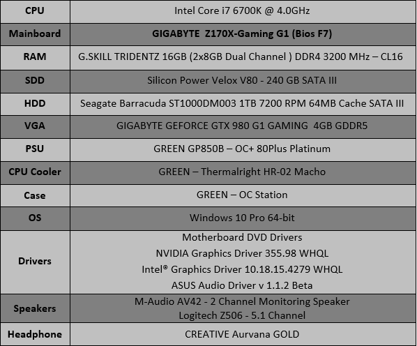 همانند بررسیهای پیشین ادوات صوتی، تستهای این کارت صدا شامل تستهای شنیداری در 3 محیط گیمینگ، تماشای فیلم و موسیقی در چند ژانر مختلف توسط 1 اسپیکر مانیتورینگ 2 Channel و 1 هدفون حرفه ای برای تستهای شبیه سازی شده پخش موسیقی و 1 اسپیکر 5.1 Channel برای تست در محیط فیلم و گیمینگ میشود. در جدول زیر میتوانید مشخصات کامل سیستم تست را ملاحظه کنید: