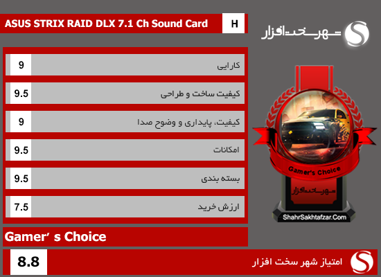 با تمامی این تفاسیر کارت صدا " ASUS STRIX RAID DLX" موفق به کسب امتیاز 8.8 و نشان "Gamer’s Choice" و ریز امتیازات زیر در کلاس محصولات (H (High End از لابراتوار شهر سخت افزار شد.