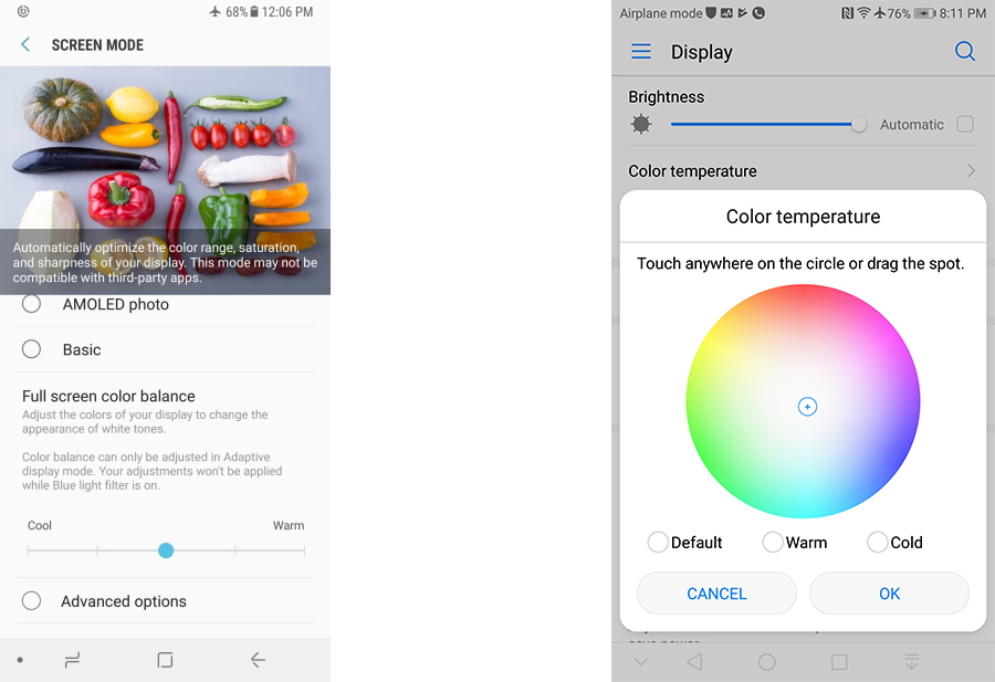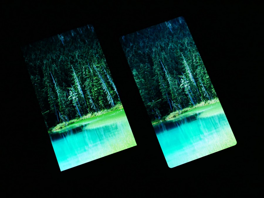 پنلهای SuperAMOLED به طور ذاتی تصاویر گرمتر و زندهتری نسبت به پنلهای IPS نشان میدهند. در حالت پیشفرض محصول هواوی تصاویر را با رنگهای طبیعی و واقعی؛ و محصول سامسونگ تصاویر را با رنگهایی زندهتر و پویاتر نمایش میدهد.