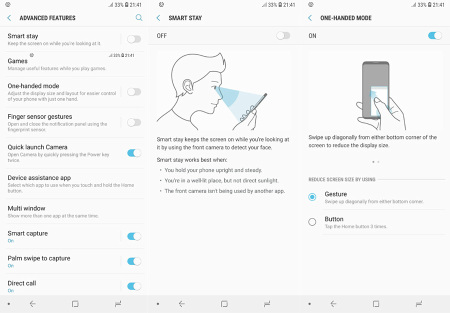 سامسونگ در بخش Advanced Features رابط کاربری، مجموعهای از جسچرها و گزینههای کاربردی را هم برای بهبود تجربه کاربران در استفاده از گوشی، درنظر گرفته است. به عنوان مثال، میتوان به گزینه Smart Stay برای روشن نگه داشتن صفحهنمایش با تشخیص نگاه کردن شما به صفحه گوشی اشاره کرد.