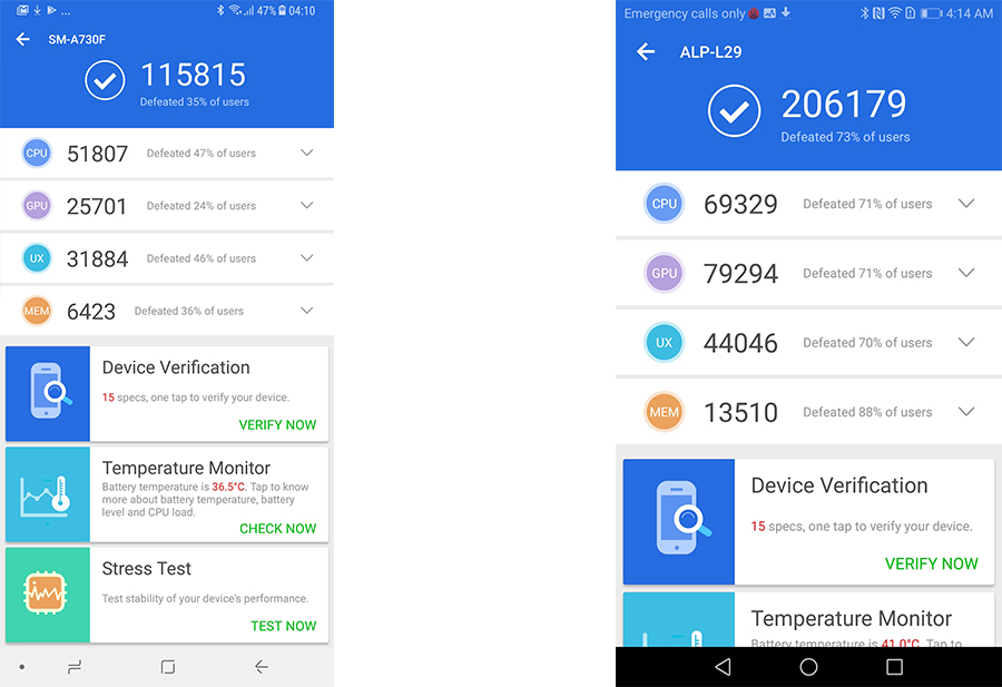 برای اینکه مقایسهای از قدرت سخت افزاری این دو گوشی داشته باشیم، اقدام به اجرای چند آزمون مختلف بر روی این گوشی کردیم. گلکسی A8+ توانست امتیاز 115815 را در آزمون انتوتو کسب کند. این درحالی است که میت 10 هواوی توانست امتیاز 206179 را کسب کند و با اختلاف بسیار زیاد در جایگاه بهتری قرار گرفت.