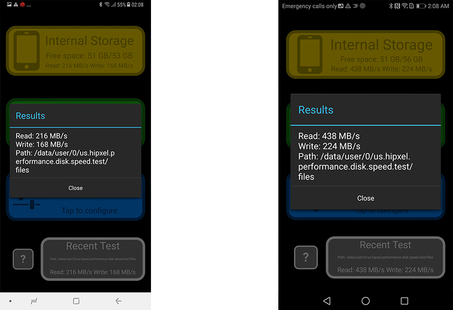 از نظر عملکرد حافظه داخلی و سرعت خواندن و نوشتن نیز میت 10 با ثبت سرعت 438 و 224 مگابایت در ثانیه برای خواندن و نوشتن، مجدداً در جایگاه بهتری نسبت به گلکسی A8+ سامسونگ با سرعت خواندن و نوشتن 216 و 168 مگابایت در ثانیهای قرار میگیرد.
