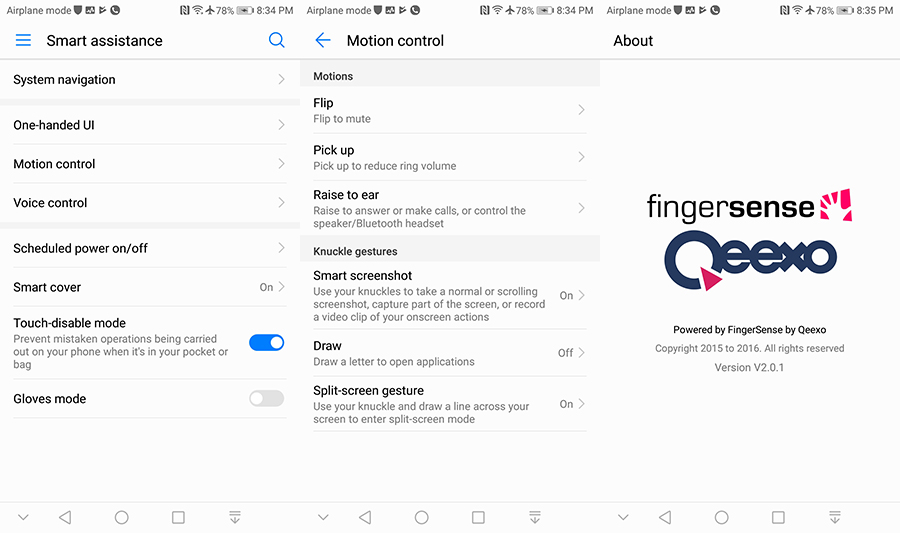در آن سوی میدان، محصول هواوی به لطف فناوری Fingersense به کار رفته در آن، از ژستهای حرکتی متعدد و متفاوتی بهره میبرد. تمامی فرامین Fingersense با کشیدن یا ضربه زدن توسط پشت بند انگشت انجام میشوند. برای مثال شما با دوبار ضربه بر روی صفحه نمایش میتوانید به راحتی از صفحه فعلی، اسکرین شات بگیرید.