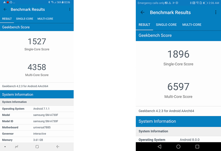 نتایج در تستهای دیگر هم به همین منوال است، در Geekbench 4 نیز گلکسی A8+ توانست امتیاز 1527 را در حالت تک هستهای و امتیاز 4358 را در حالت چند هستهای کسب کند، در حالی که میت 10 توانست امتیاز 1896 را در حالت تک هستهای و امتیاز 6597 را در حالت چند هستهای بدست آورد.