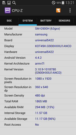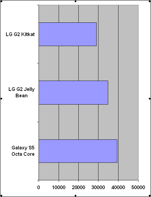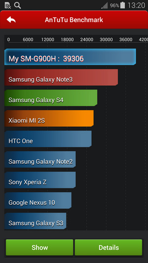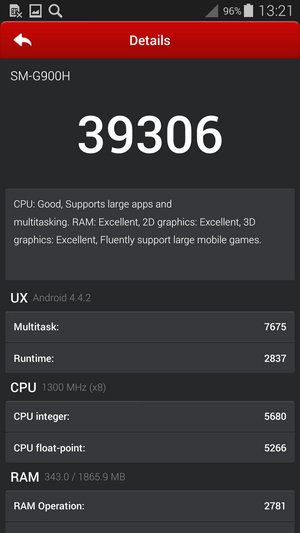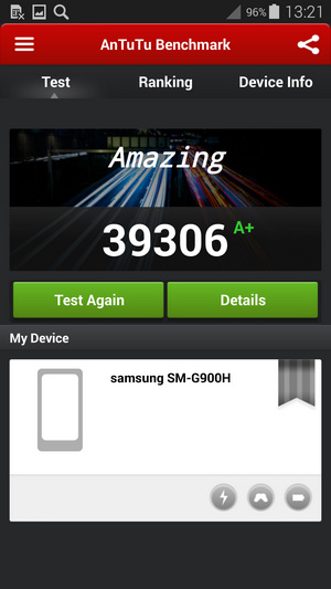 با تمام این تفاسیر ما چیپست 5422 را به کمک اپلیکیشن بنچمارک Antutu نسخه 4 به معرض تست می گذاریم. جایی که گلکسی اس 5 به طرز شگفت انگیزی امتیاز 39306 را بدست می آورد و بر اساس بنچمارک های رسمی در منابع اینترنتی بالاترین امتیاز را از آن خود می کند! این امتیاز در مقایسه با امتیاز 34788 گوشی LG G2 با اندروید جلی بین و یا 29005 همین گوشی با اندروید کیت کت بسیار عالی و در نوع خود تک است.