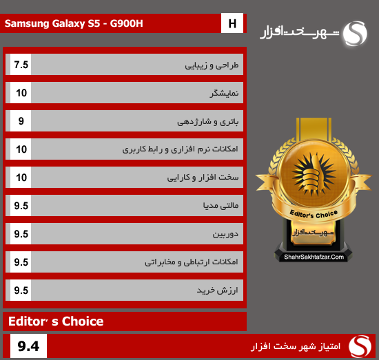 حال با کلیه حرف های گفته شده در این بررسی در نهایت گلکسی اس 5 توانست امتیاز 9.4 از 10 را از شهر سخت افزار با بالاترین نشان "Editor's Choice" با توجه به قیمت 1.8~2 میلیون تومانی بدست بیاورد.