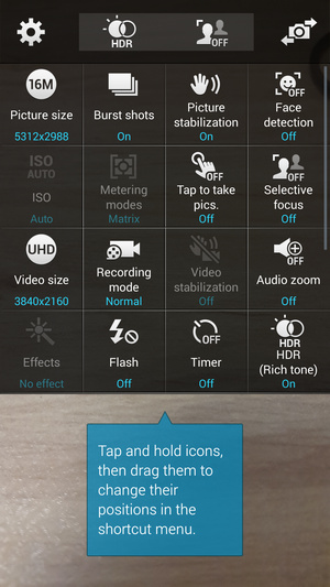 منوی دوربین گلکسی اس 5 ضمن دارا بودن ویژگی های نسل پیشین در برخی موارد ارتقا یافته است. ضمن اینکه نحوه چینش آیکون ها و دسترسی به امکانات دوربین عوض شده است ویژگی های جدیدی همچون Selective Focus و HDR Rich Tone و Audio Zoom به آن اضافه گشته است.