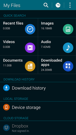 فایل منیجر پیش فرض نیز در گلکسی اس 5 دچار تغییراتی در ظاهر شده است. آیکون ها همانند آیکون های منوی تنظیمات بصورت گرد و رنگی در آمده اند همچنین در پایین صفحه همانطور که مشاهده می کنید پشتیبانی مستقیم از دراپ باکس نیز وجود دارد و می توانید دسترسی سریع به محتویات فضای ابری در دراپ باکس داشته باشید. همچنین از داخل فایل منیجر می توانید به راحتی محتویات دلخواه را بصورت فشرده یا ZIP درآورید، در واقع فایل منیجر نصب شده بر روی گلکسی اس 5 هرچند به خوبی بهترین های مارکت اندروید نیست اما برای استفاده های اولیه کافی می باشد.