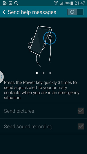 قابلیت بسیار مفید دیگری که در گلکسی اس 5 پیش بینی شده است مربوط به ارسال پیام اضطراری است که با فعال کردن آن و سه بار فشردن دکمه پاور پیام از پیش تعیین شده ای را به شماره های خاص از لیست مخاطبین می فرستد. همچنین امکان تهیه یک عکس بطور مخفی و ارسال آن همراه با پیام را نیز دارد.